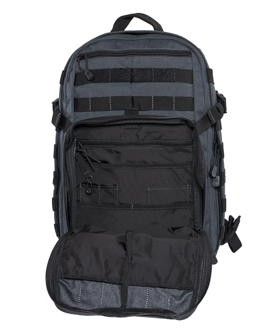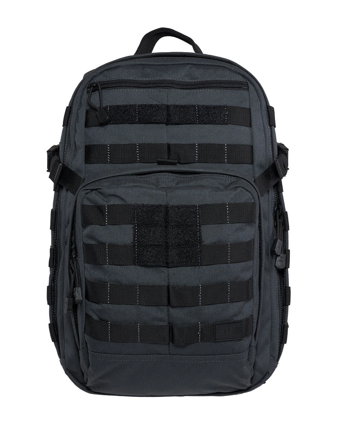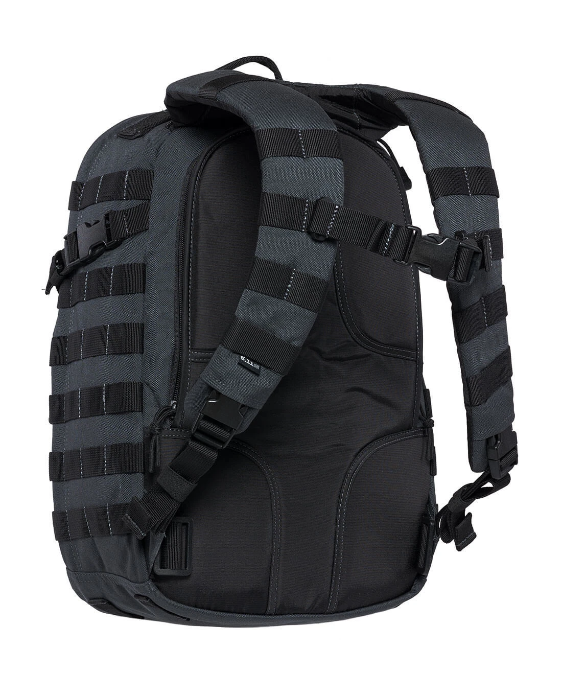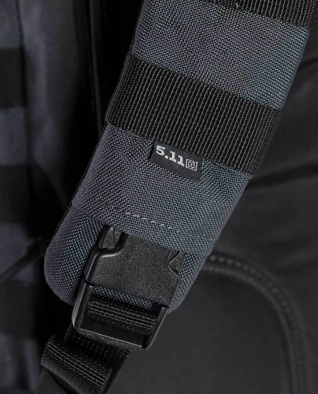 Das M.O.L.L.E.-System der Rush Reihe dient der modularen Nutzung des Rucksacks, ist aber auch ein signifikantes Design-Merkmal des Klassikers: Die M.O.L.L.E.-Streifen verlaufen sowohl auf der gesamten Front des Rucksacks als auch zu dessen Seiten; sie laufen in der Mitte zum typischen Centre-Line Design von 5.11 Tactical zusammen. Auf der Bodenplatte finden sich ebenfalls Gurtschlaufen.