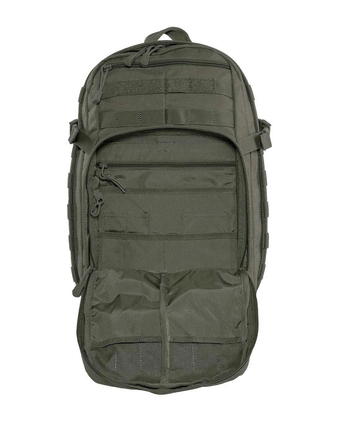 Dank des robusten und wasserdichten CORDURA 1050 den ist der Rucksack für jedes Wetter gewappnet. Zusätzliche Taschen und Pouches können wie es sich für einen taktischen Rucksack gehört über das umlaufende M.O.L.L.E.-System angeschlossen werden. Sowohl die gesamte Vorderseite, als auch die Seiten und die Bodenplatte werden von den M.O.L.L.E.-Streifen bedeckt. Es entsteht dadurch der signifikante Look der 5.11 Tactical Rucksäcke: Die Gurtbandstreifen laufen in der Mitte des Frontfachs zusammen und bilden das bekannte 5.11 Centre-Line Design.