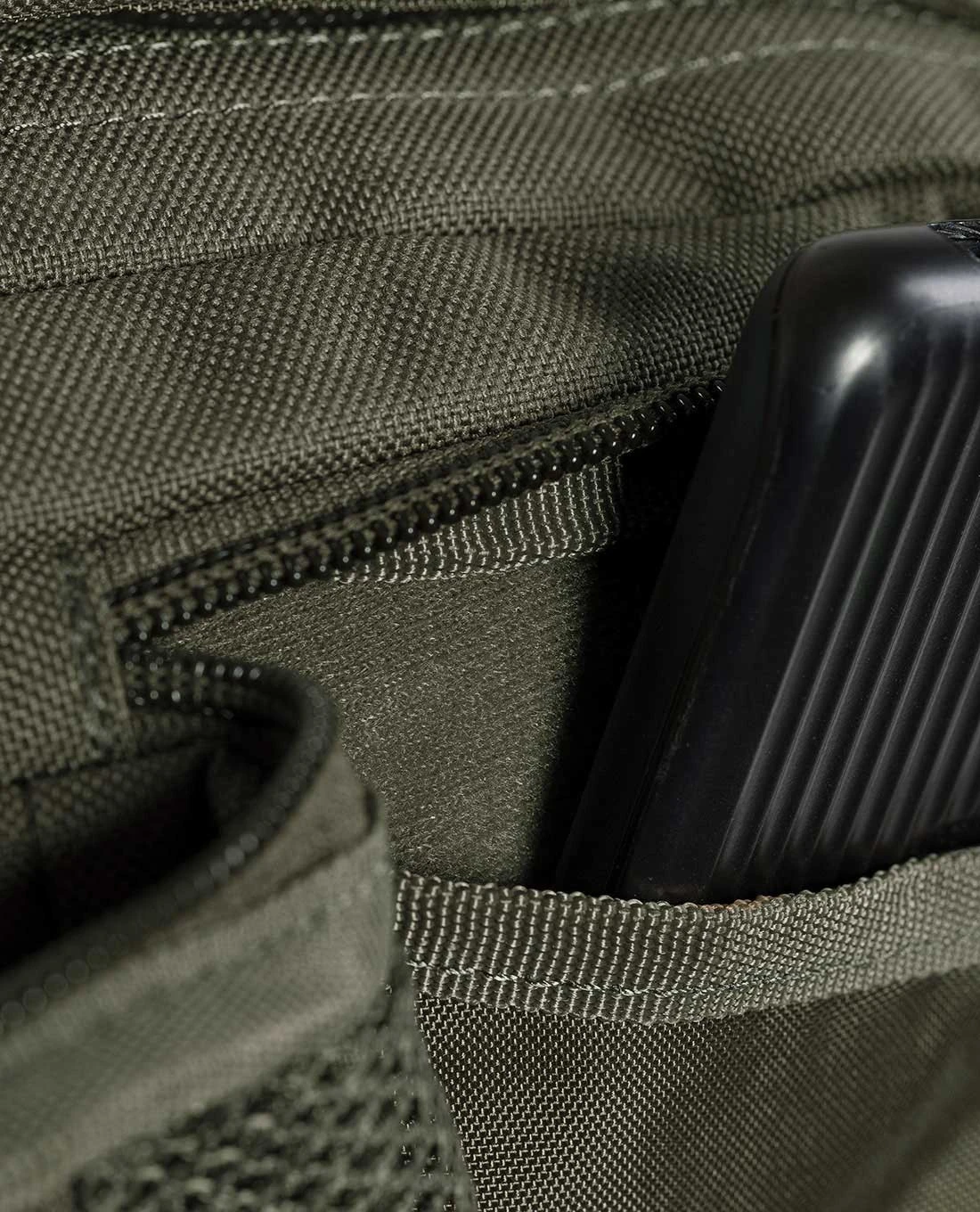 Die untere der beiden Front-Taschen ist die Größere der beiden; hier können in Einschubfächern und einem Reißverschlussfach Kleinigkeiten sortiert werden. Hinter dieser Front-Tasche liegt bei der neuen Version des Rush Einsatzrucks nun auch ein weiteres, verstecktes Fach mit einem Klettverschluss. Das Fach ist vollständig verborgen und darum gerade für sensible Dokumente oder diskret zu verpackende Ausrüstung geeignet.
