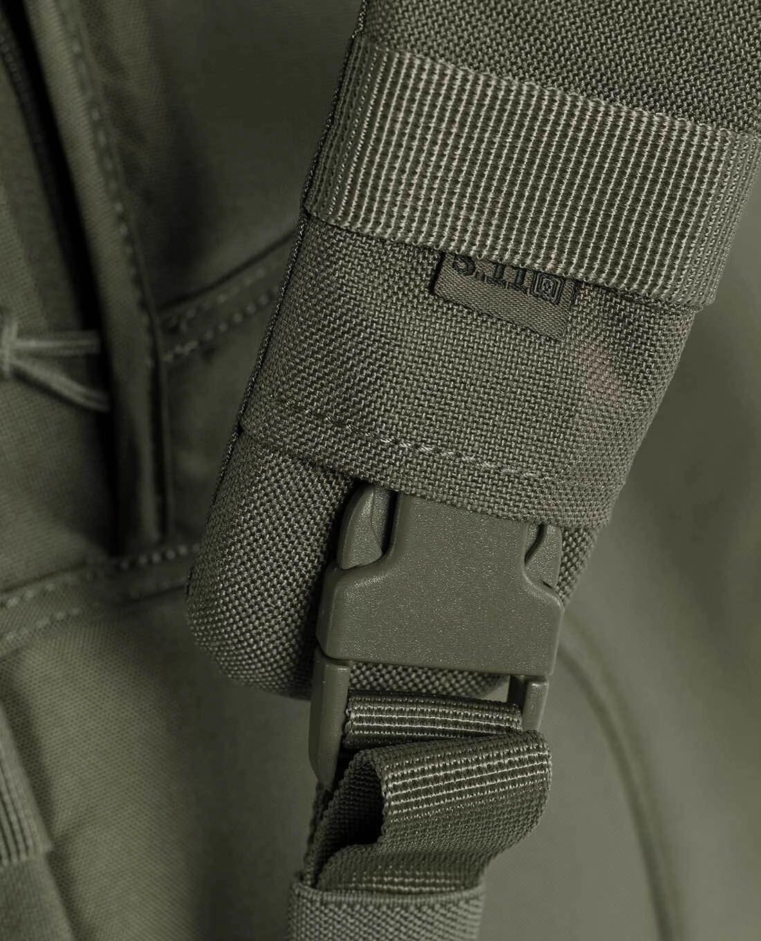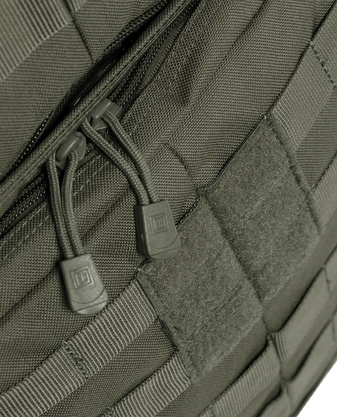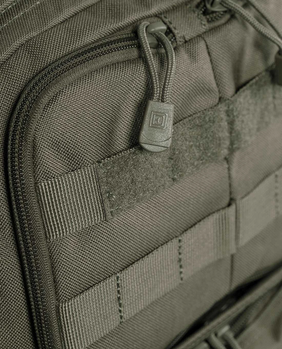 Noch mehr Ausrüstung, Zusatztaschen und Mag Pouches können am umfangreichen und obligatorischen M.O.L.L.E.-System angebracht werden. 5.11 Tactical hat hier nicht am üppigen Gurtband gespart und die M.O.L.L.E.-Streifen fast umlaufend angebracht: SIe bestücken sowohl die gesamte Vorderseite, als auch die Seiten und die Bodenplatte. Das M.O.L.L.E.-System ist es auch, dass dem Rush24 seinen besonderen Look gibt: Die Streifen laufen in der Mitte symmetrisch zusammen und bilden damit das für 5.11 Tactical typische Center Line Design – ein Design mit Wiedererkennungswert!