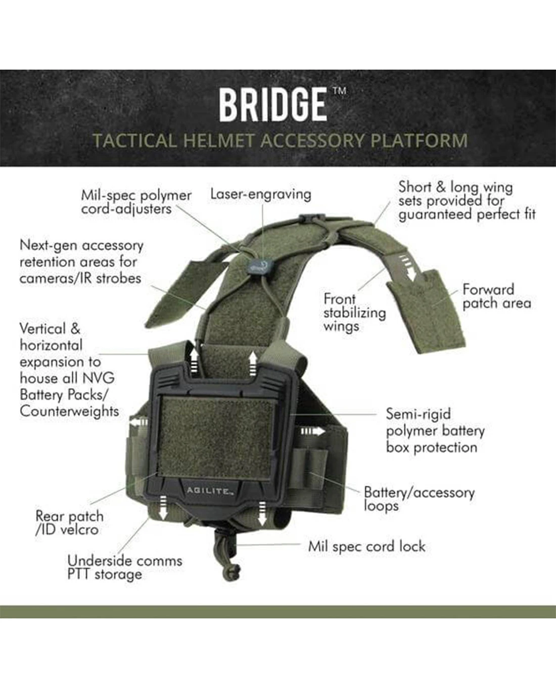 Schon lange sind Helme von Spezialeinheiten und spezialisierten Kräften nicht mehr blank – Patches, Nachtsehmittel, Batterie-Packs, Gegengewicht, Kamera, IR-Beacon, Kabel und mehr teilen sich das bisschen Platz. Selbst mit viel Flauschfläche auf dem Helm wird das sichere Montieren und Organisieren der Helmzubehörteile schnell herausfordernd – Mit der Agilite Bridge Tactical Helmet Accessory Platform ist die sichere Montage und Anordnung von essenzieller Ausrüstung nun deutlich leichter. So kann das komplette Equipment als zusammenhängende Einheit von einem ballistischen Helm auf einen Bump-Helm gewechselt oder vor Einsätzen in diebstahlgefährdeten Bereichen leicht demontiert werden.