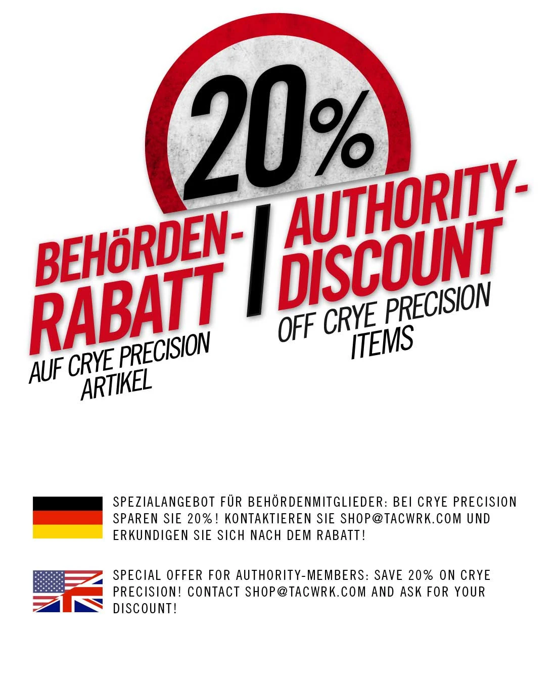 *Besonders bei Artikeln von Crye-Precision lohnt sich unser Behörden-Rabatt! Alle Polizei- Militär und weitere Behördenangehörige sparen 20% auf Crye-Artikel beim TACWRK. Einfach per E-Mail bei [email protected] anfragen und wir informieren Sie dann wie Sie Ihren Erlass erhalten bzw. Ihre Bestellung aufgeben.