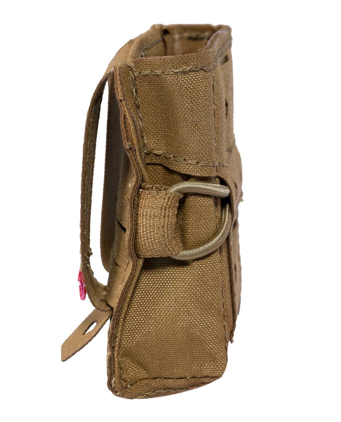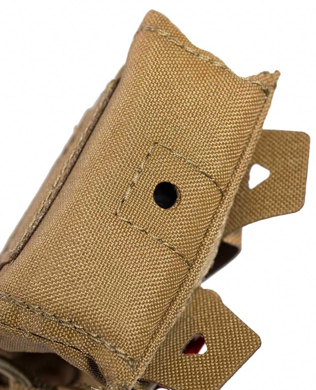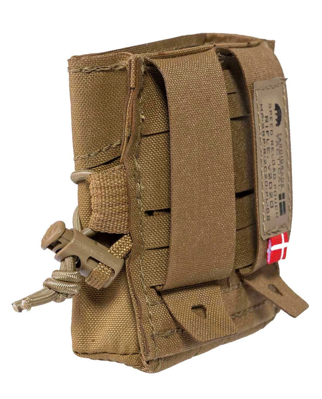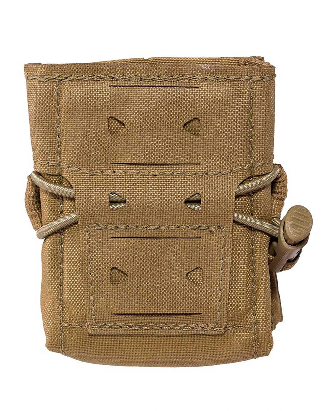 Die Mag Pouch ist für Magazine der Machart M4, AR15, Sig MCX, HK416, und ähnlich große 556 Nato Kaliber Gewehr-Magazine passend, hat natürlich aber auch Platz für Gewehrmagazine ähnlicher Größe. Zusätzlich kann auf der Vorderseite eine Pistolen-Magazintasche befestigt werden; M.O.L.L.E. Schlitze in Lasercut Ausführung sind dafür vorgesehen. das M.O.L.L.E.-System dient auch der Befestigung der Zubehörtasche.