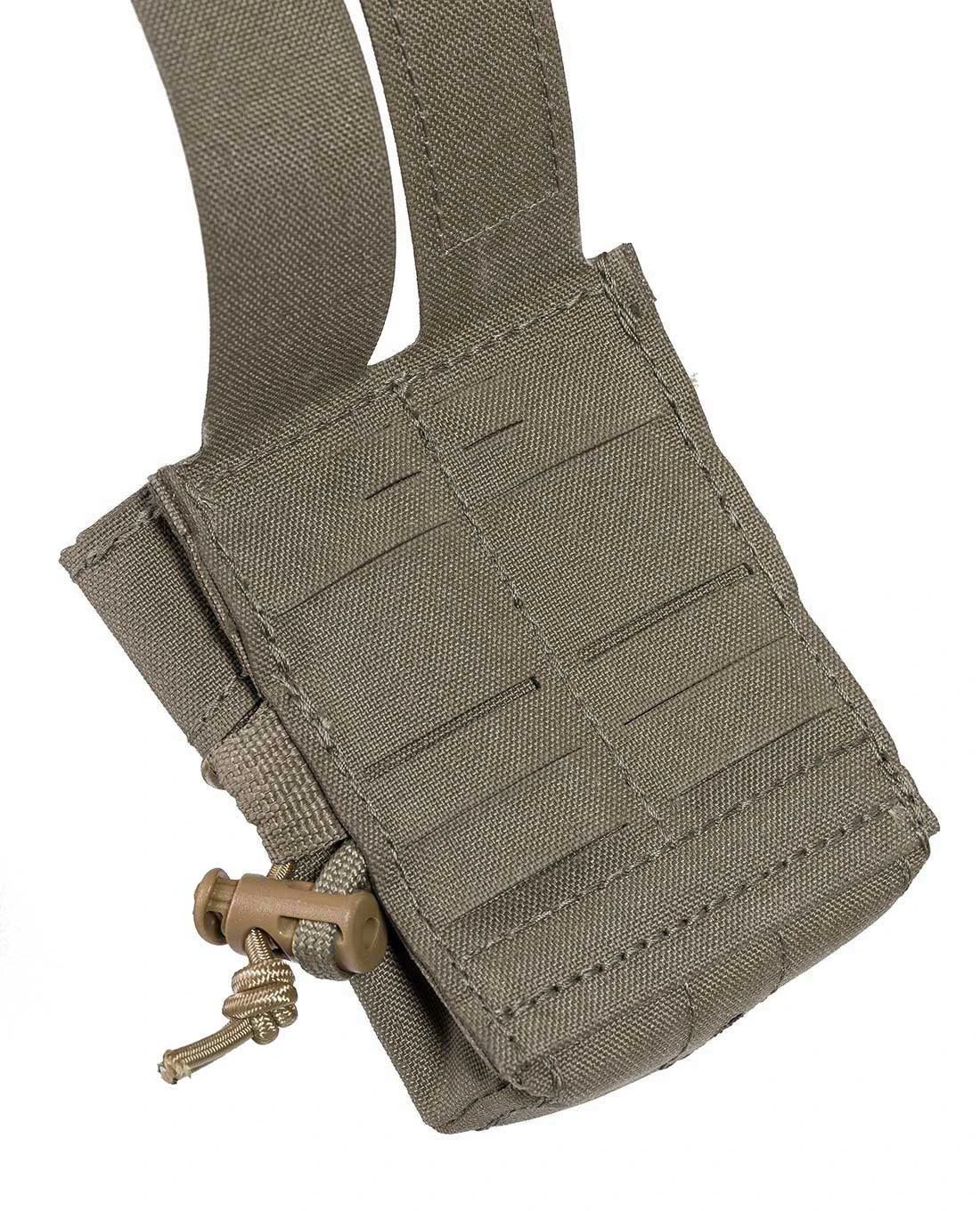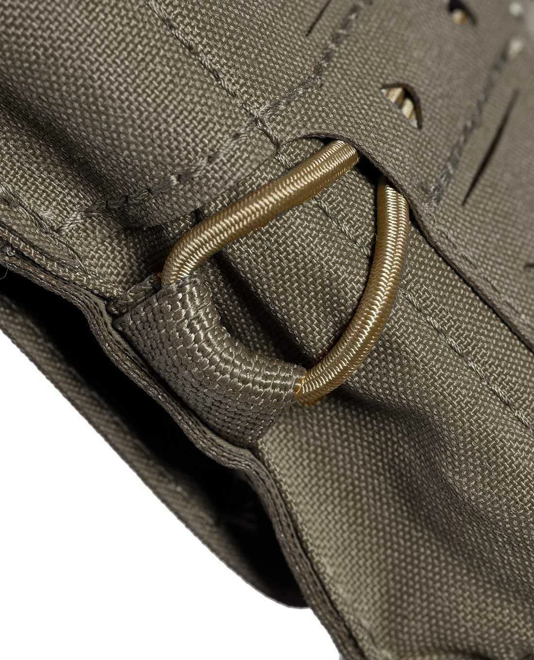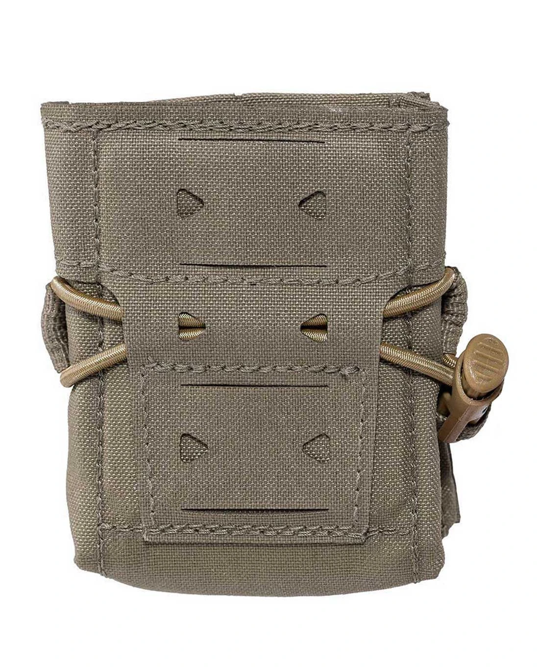 Die taktischen Kollegen aus dem hohen Norden haben auch ihre Rifle Mag Pouch in einer 2020er Version überarbeitet und legen mit der Speed Reload Pouch – Rifle v2020 eine mag pouch vor, die mit wenig Material und viel Sicherheit aufwartet. Die kleine Zubehörtasche wird aus Mil-Spec CORDURA gefertigt und vereint die weiche Struktur des Nylon mit verstärkten Teilen auf der Frontseite und an Rändern. Durch diese Versteifung bleibt die Form der Magazintasche erhalten und ein Magazin kann blind und und mit einer Hand eingeschoben werden. Die versteifte Form trägt auch der Sicherung des Magazins bei, das allerdings in der Hauptsache von einem umlaufenden Bungee-Cord mit Kordelstopper gehalten wird. Auf der Vorderseite sind außerdem M.O.L.L.E.-Schlitze in Lasercut-Ausführung angebracht, mit der eine weitere Pistolenmagazintasche befestigt werden kann. Obwohl auch Magazine ähnlicher Größe passen, ist die Speed Reload Pouch Rifle für Magazine der Machart M4, AR15, Sig MCX, HK416, und ähnlicher 556 Nato Kaliber Gewehr-Magazine gemacht. Befestigt wird die Magazintasche mit dem M.O.L.L.E.-System.