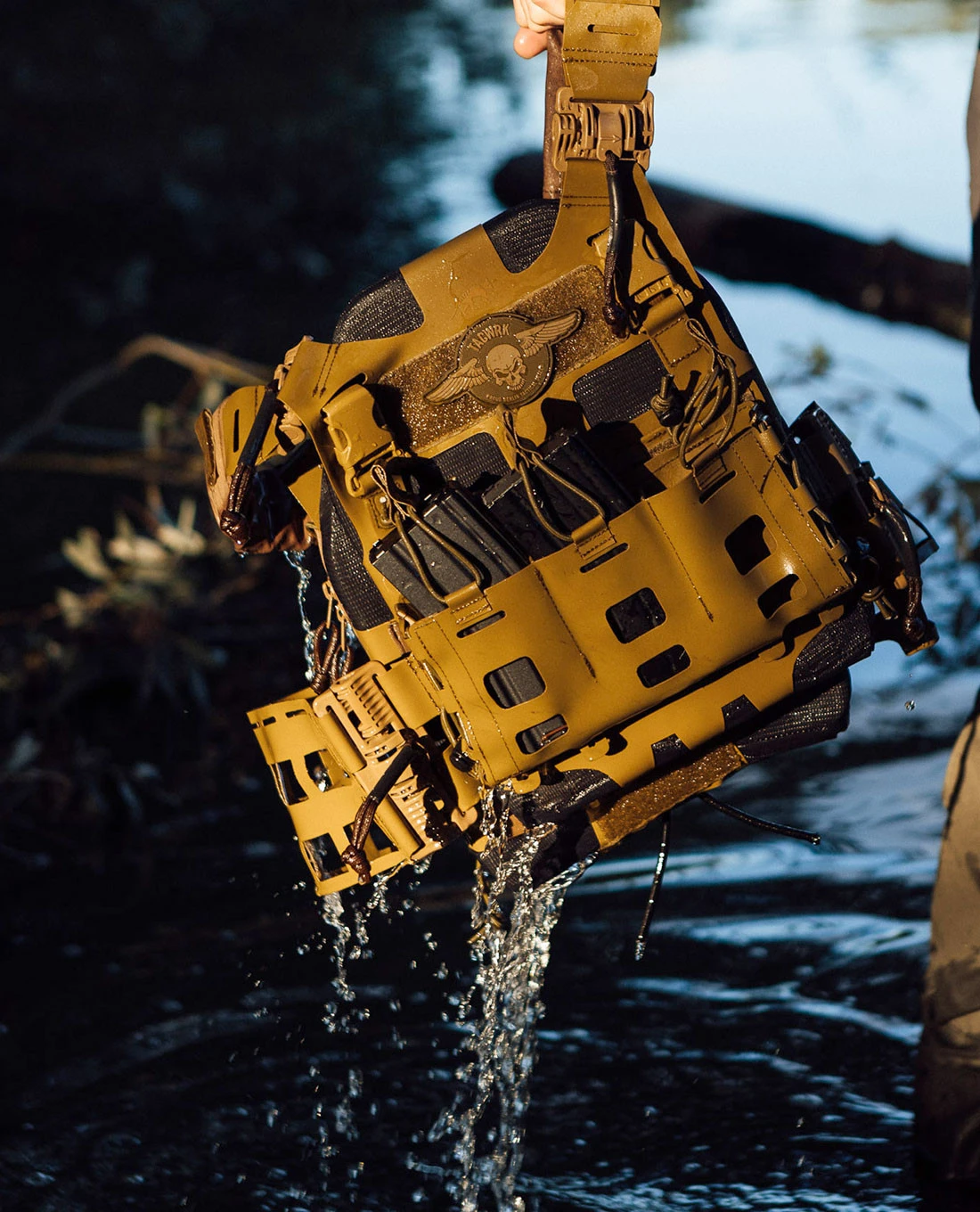 Sowohl die Skelettierung der Oberfläche, als auch das Material machen die „anfibia“ Serie von TT zu effizient amphischer Gear. Auch das Carrier Mag Panel wird aus TPU Cordura 700 den gefertigt, das see- und damit salzwasserbeständig ist. Die Skelettierung sorgt für das schnelle Ablaufen von eingetretenem Wasser und verhindert vollgesogenes, beschwertes Materialvolumen. Gleichzeitig dient die Skelettierung auch der M.O.L.L.E-Befestigung optionaler Magazintaschen.
