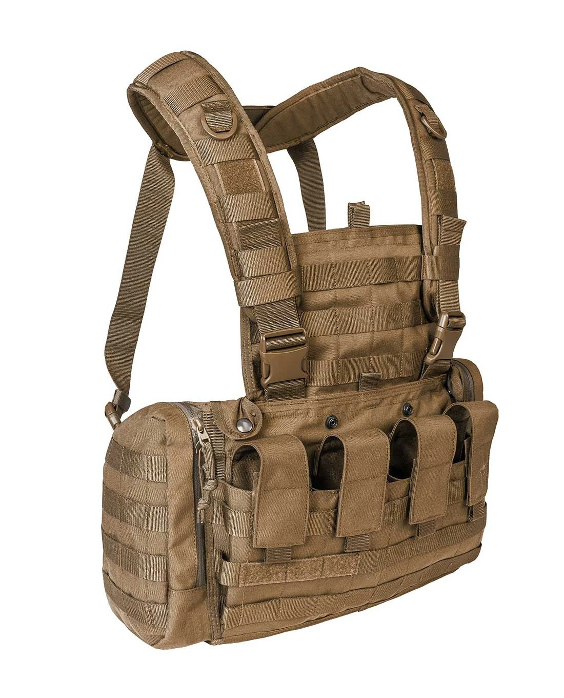 Die Chest Rig MK II, die es jetzt auch in der neuen TT Farbe Coyote gibt, verfügt über eine ausklappbare Einschubtasche für eine Schutzplatte (nicht im Lieferumfang enthalten) und vier Magazintaschen für G36/SIG/AUG oder Mf-M16 Magazine. Dieses universell nutzbare, leichte Gurtzeug überzeugt durch die gute Polsterung an den Belastungspunkten und seine individuelle Anpassbarkeit durch verstellbare Gurte. Je eine Mehrzwecktasche an der Seite bietet ausreichend Platz für 1 l-Wasserflaschen. Mit Reißverschlüssen oder verstellbaren Klettverschlusssystem kann jede Tasche sicher verschlossen werden. Das obligatorische Molle-System macht außerdem die Nutzung gemeinsam mit weiterer Ausrüstung leicht.