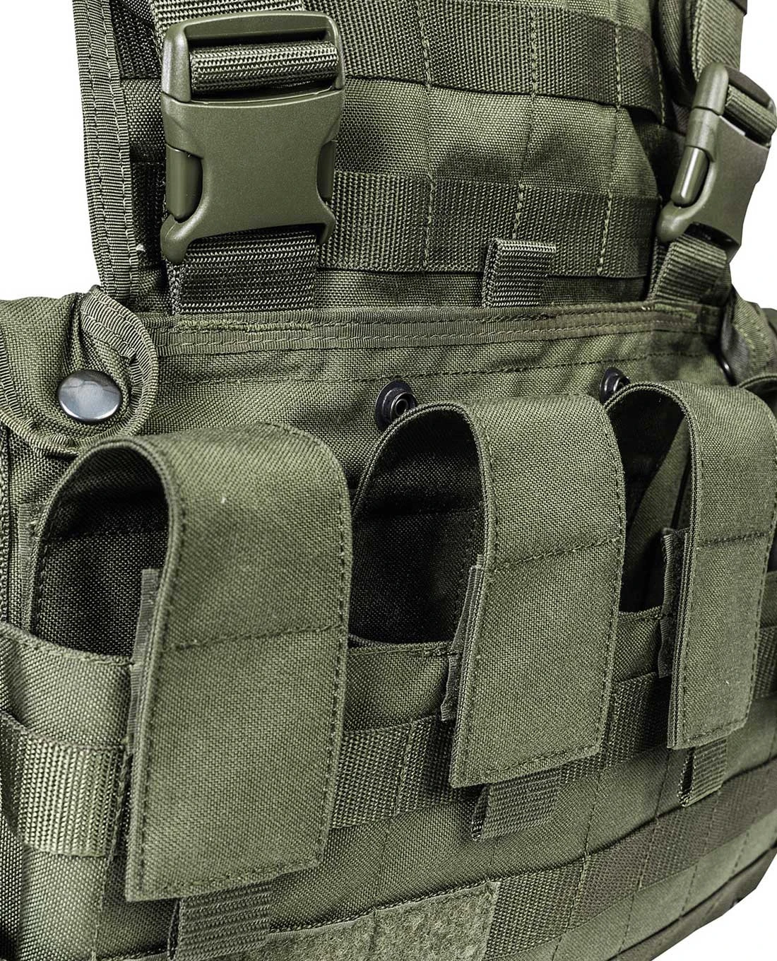 Die besonders leichte, universell einsetzbare Kampfmittelweste von Tasmanian Tiger wird über verstellbare, gut gepolsterte Träger getragen und verfügt über eine ausklappbare Einschubtasche für eine Schutzplatte (nicht im Lieferumfang enthalten). Für G36/SIG/AUG oder Mf-M16 Magazine ist in vier separaten Magazintaschen Platz, 1 l-Wasserflaschen können in den beiden Mehrzwecktaschen an den Seiten mitgeführt werden. Die einzelnen Taschen werden über Reißverschlüsse oder verstellbare Klettverschlusssysteme geschlossen. Dank Molle-System kann die Weste einfach mit weiterer Ausrüstung kombiniert werden.