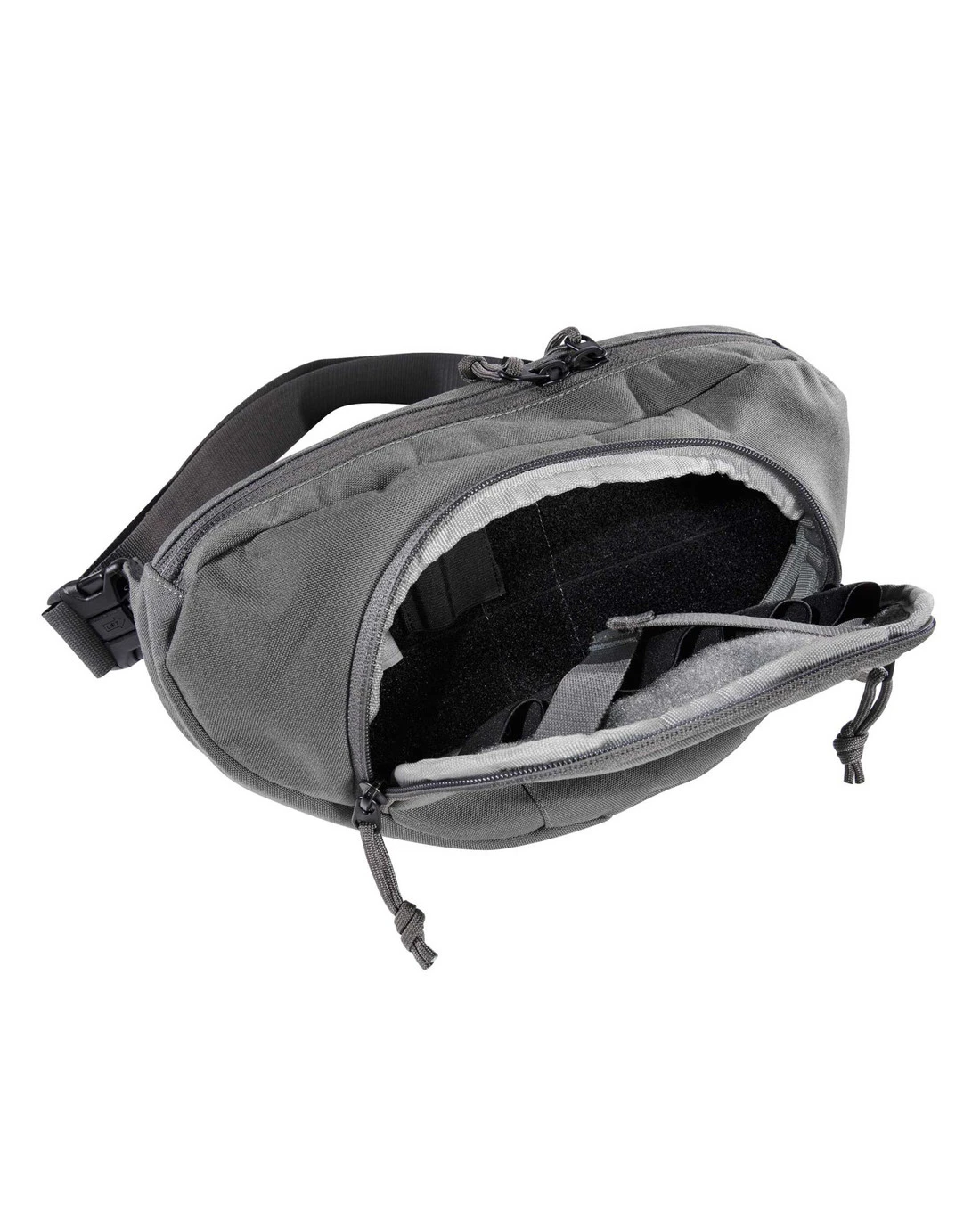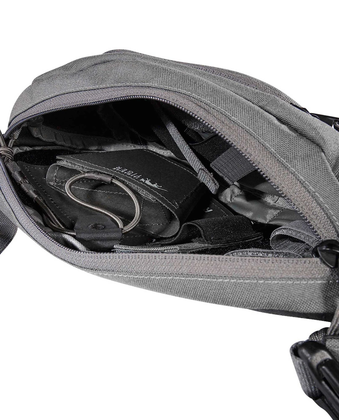 Die 32 x 17 x 5 cm große Gürteltasche kann entweder mit einem verstellbaren Bauchgurt getragen werden, der gegen eine Fremdöffnung gesichert ist. Sie kann aber auch mittels zweier Schlaufen auf der Rückseite direkt am Gürtel befestigt werden. Um den Sitz zu verbessern und ein Verrutschen zu verhindern, ist die Rückseite der Hüfttasche mit einer Anti-Rutsch-Fläche ausgestattet. Im typischen Cordura 200 den besonders robust und mit 3 Litern Fassungsvermögen eine geräumige Ergänzung Eurer gear ist die Hip bag in Titan Grey vor allem eine nützliche Ergänzung im verdeckten Einsatz.
