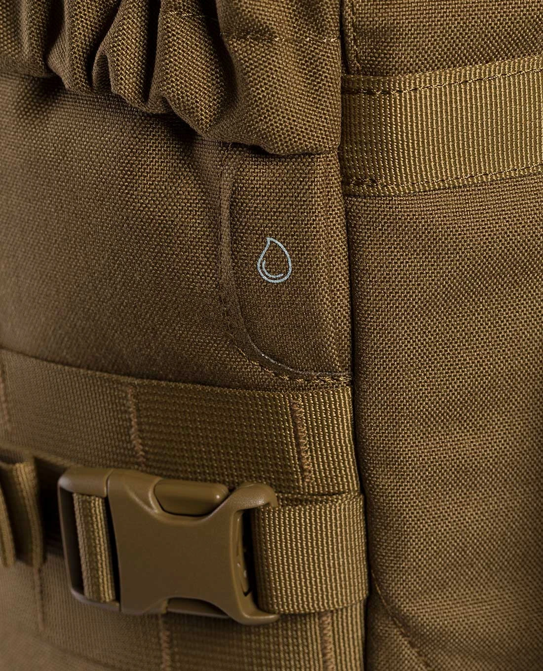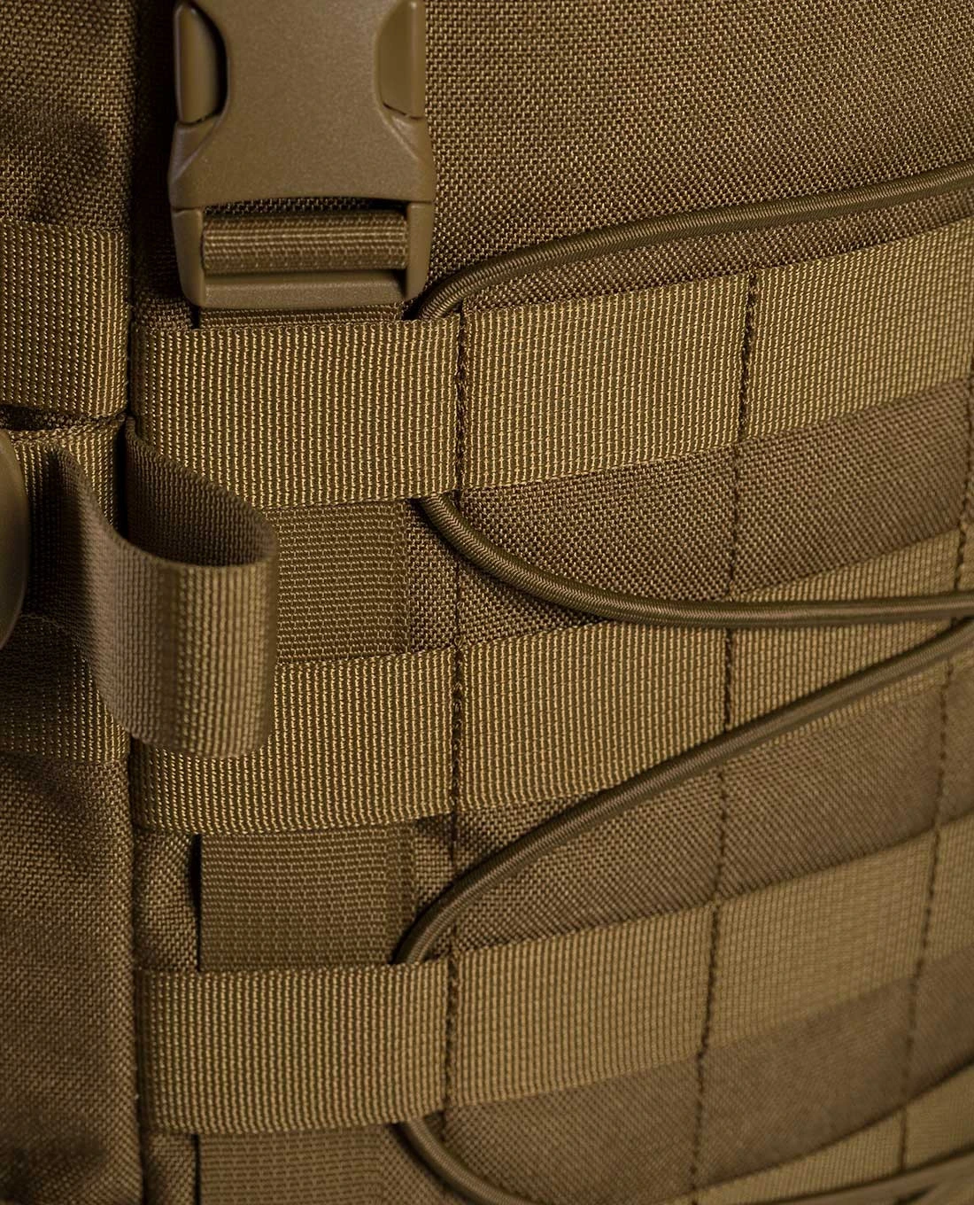 Für die notwendige Versatilität und Individualisierbarkeit sorgt das selbstverständliche M.O.L.L.E. System, an dem Taschen und Zubehör beliebig befestigt werden können. Auch im Inneren ist das taktische Setup auf den Punkt gebracht: Ein Einsteckfach für eine Trinkblase mit einem Ausgang zu den Seiten sowie eine Elastikspinne auf der Frontseite für das schnelle Einschieben einer Jacke oder Flasche sind für eine super flexible Nutzung gedacht. Zu beiden Seiten befinden sich Einstecktaschen für einen schnellen Zugriff. Der Deckel erweitert das Hauptfach und kann über einen Reißverschluss zugänglich gemacht werden.