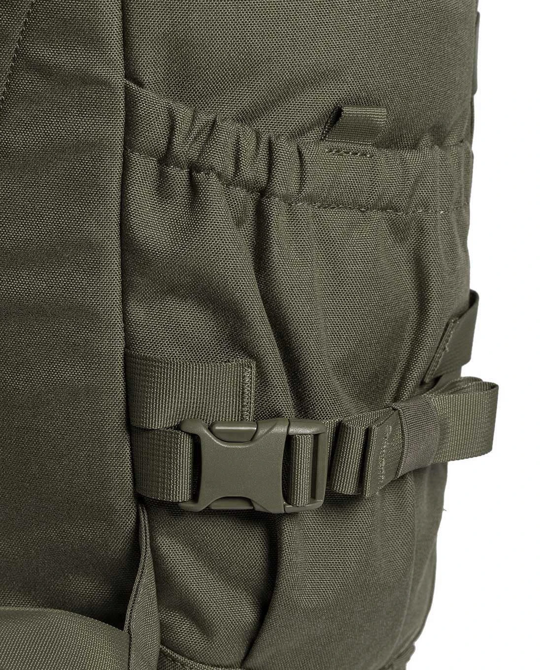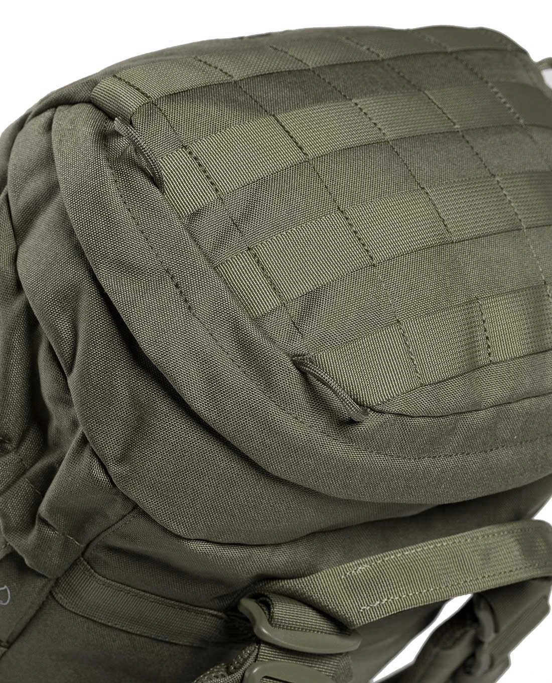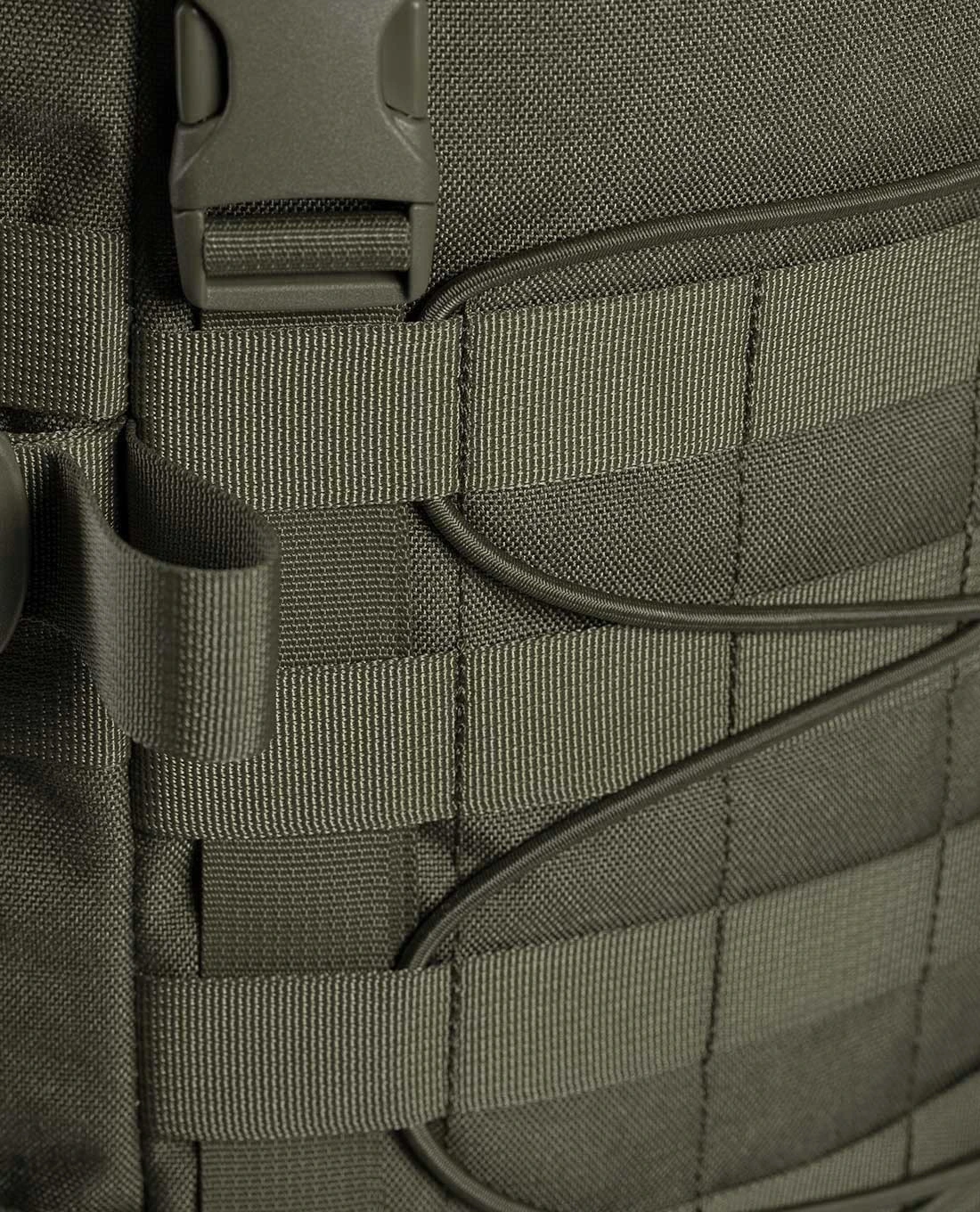 Zu beiden Seiten befinden sich Einstecktaschen für einen schnellen Zugriff und der Deckel erweitert das Hauptfach. Er ist außerdem über einen Reißverschluss zugänglich. Das M.O.L.L.E. System erlaubt es, Taschen und Zubehör anzuschließen. Wird das volle Volumen des Rucksacks einmal nicht ausgenutzt, dann kann mit den Kompressionsriemen an Trage-Volumen eingespart werden.