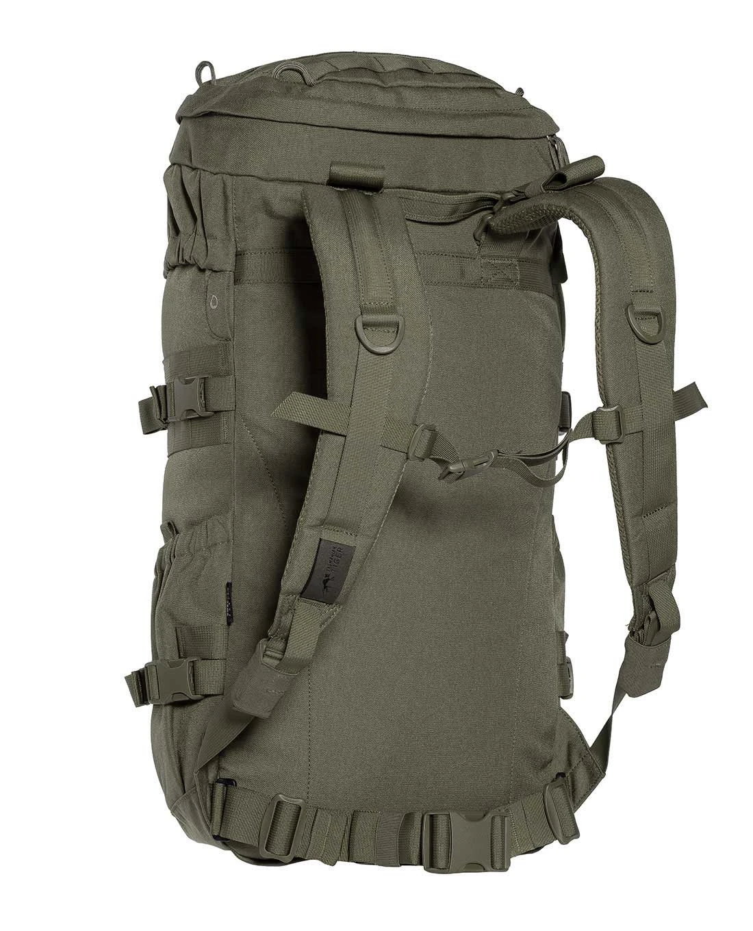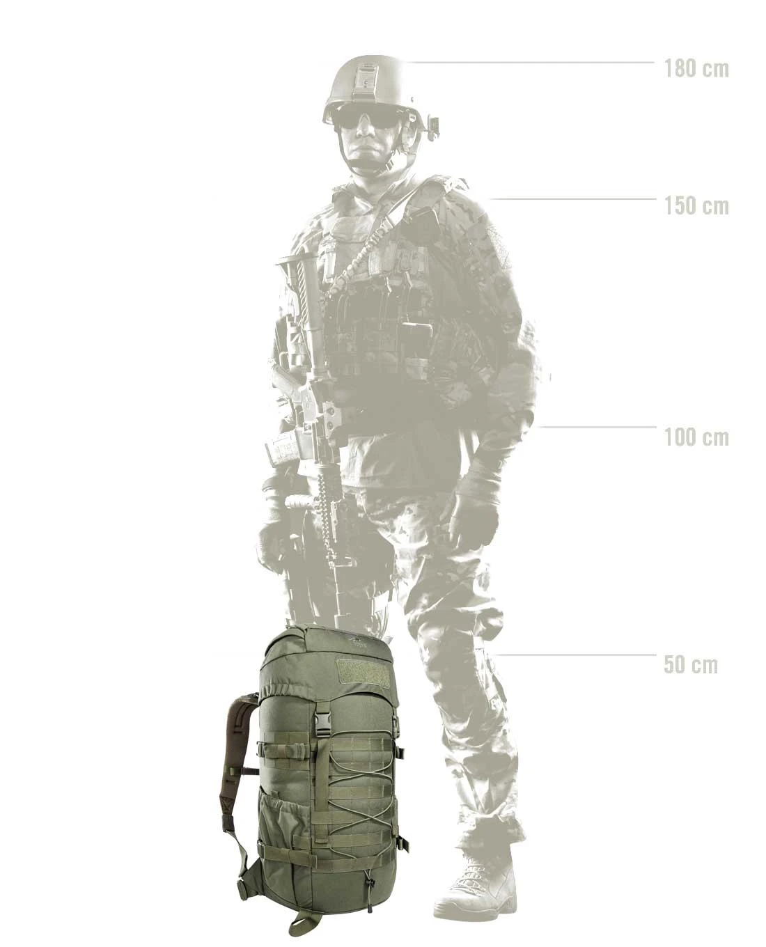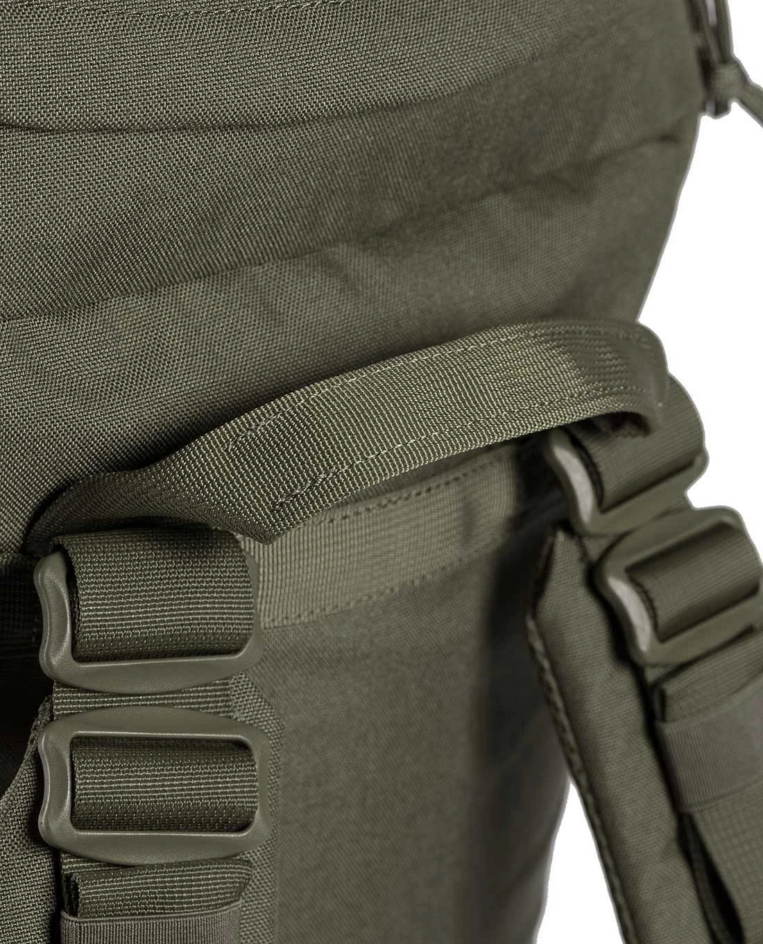 Zu beiden Seiten befinden sich Einstecktaschen für einen schnellen Zugriff und der Deckel erweitert das Hauptfach. Er ist außerdem über einen Reißverschluss zugänglich. Das M.O.L.L.E. System erlaubt es, Taschen und Zubehör anzuschließen. Wird das volle Volumen des Rucksacks einmal nicht ausgenutzt, dann kann mit den Kompressionsriemen an Trage-Volumen eingespart werden.