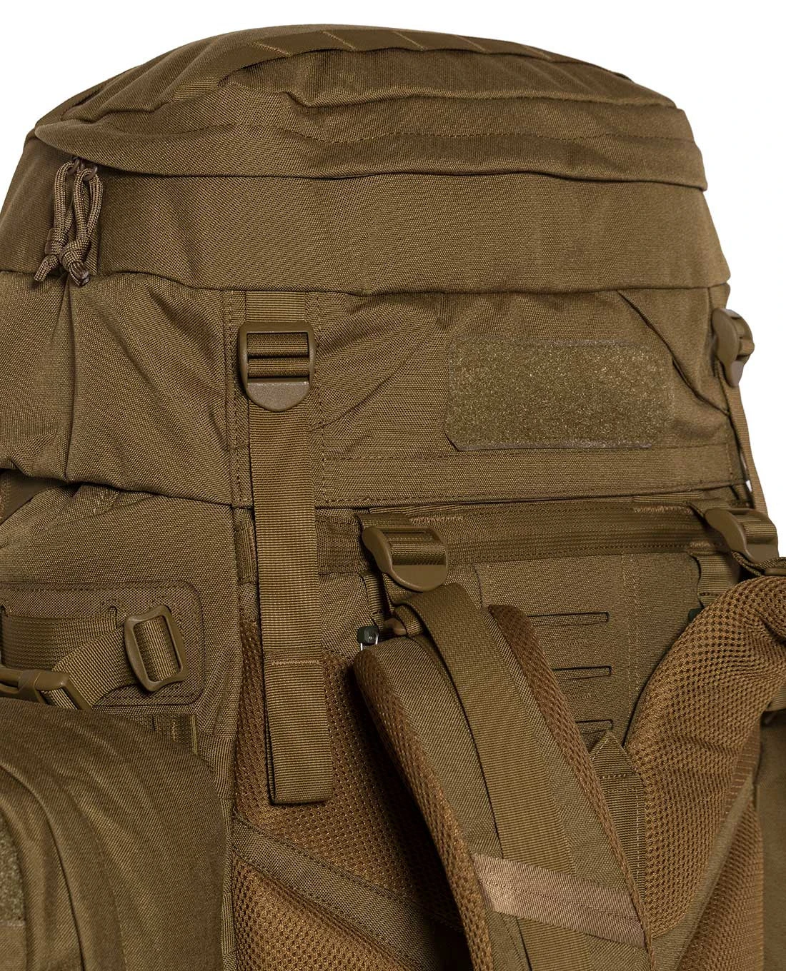 Wird das Gesamtvolumen einmal nicht erreicht, kann der Rucksack mit den seitlichen Kompressionsriemen zusammengezurrt werden. Auch am Boden des Kampfrucksacks verlaufen Kompressionsriemen, die zur Befestigung weiterer Ausrüstung wie zum Beispiel eines Schlafsacks dienlich sind. Schlaufen für Eisgeräte oder Stöcke und selbstverständlich das M.O.L.L.E.-System bringen die typische Individualisierbarkeit des taktischen Einsatzrucksacks ins Spiel.