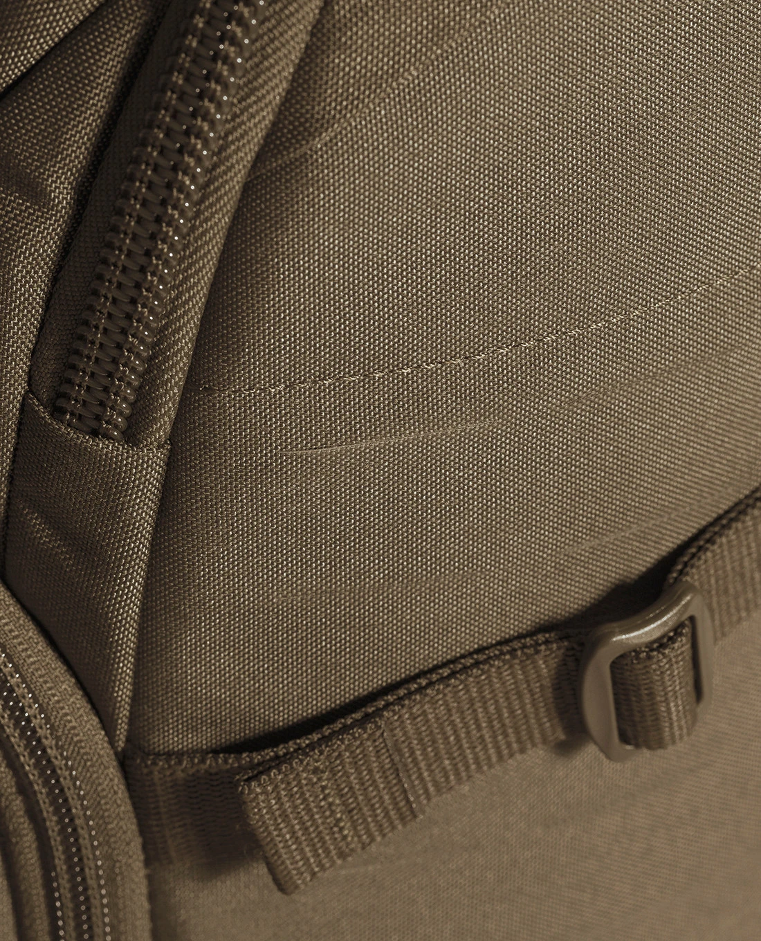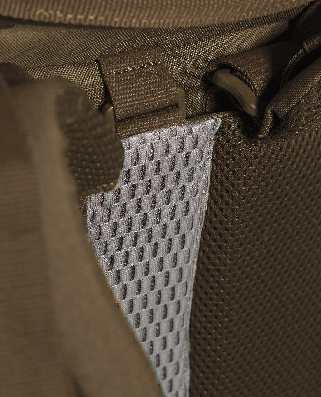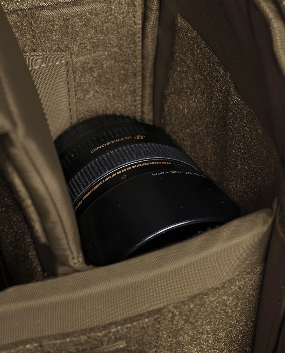 Ein geräumiges Deckelfach sorgt für adäquaten Stauraum und extra tiefe Seitentaschen wurden speziell für die Aufnahme von Stativen ausgelegt, die sich durch seitliche Kompressionsriemen zuverlässig sichern lassen. Das umlaufende M.O.L.L.E.-System im Lasercut-Design erlaubt das individuelle Erweitern und Anbringen zusätzlicher Taschen und Holstern.