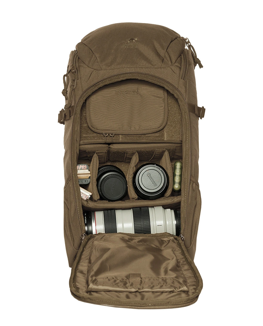 Das Tasmanian Tiger Modular Camera Pack 30 wurde als moderner Kamera- und Dokumentationsrucksack konzipiert, dessen Fokus ausdrücklich auf erhöhtem Trage- und Bedienkomfort liegt. Das Hauptfach verfügt neben einem Front- auch über einen separierten Extra-Zugriff von oben, um Kamera und Foto-Equipment rasch und unkompliziert entnehmen zu können.