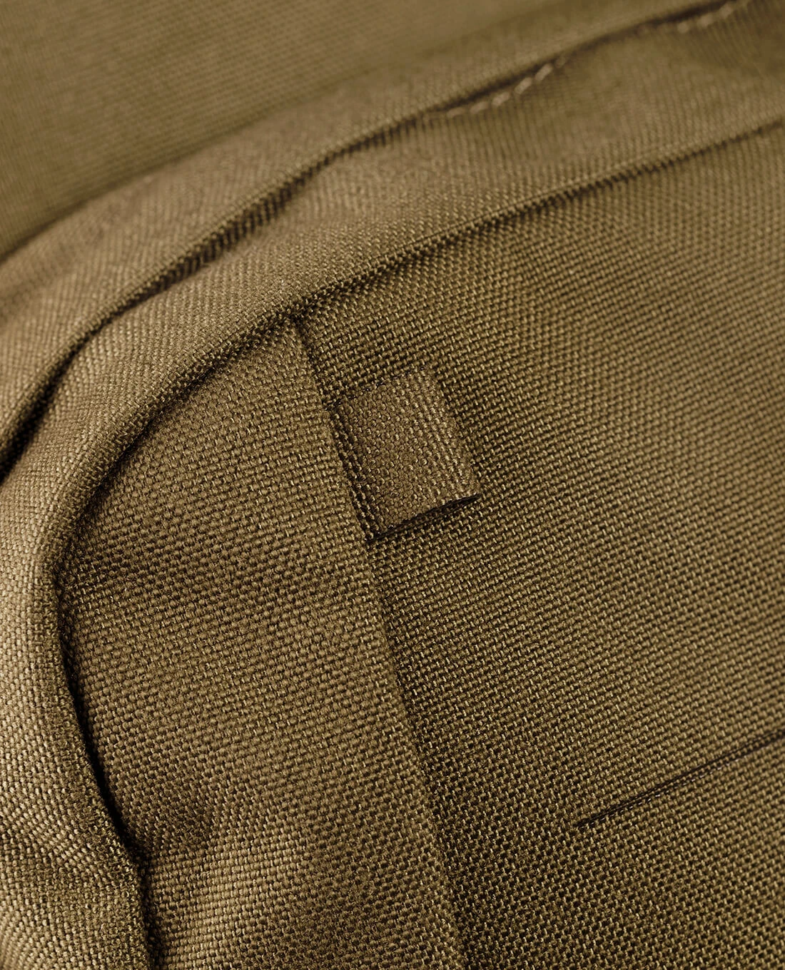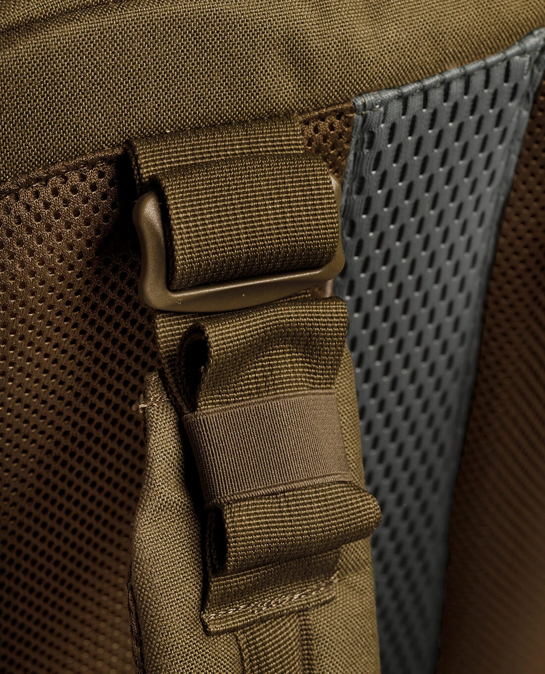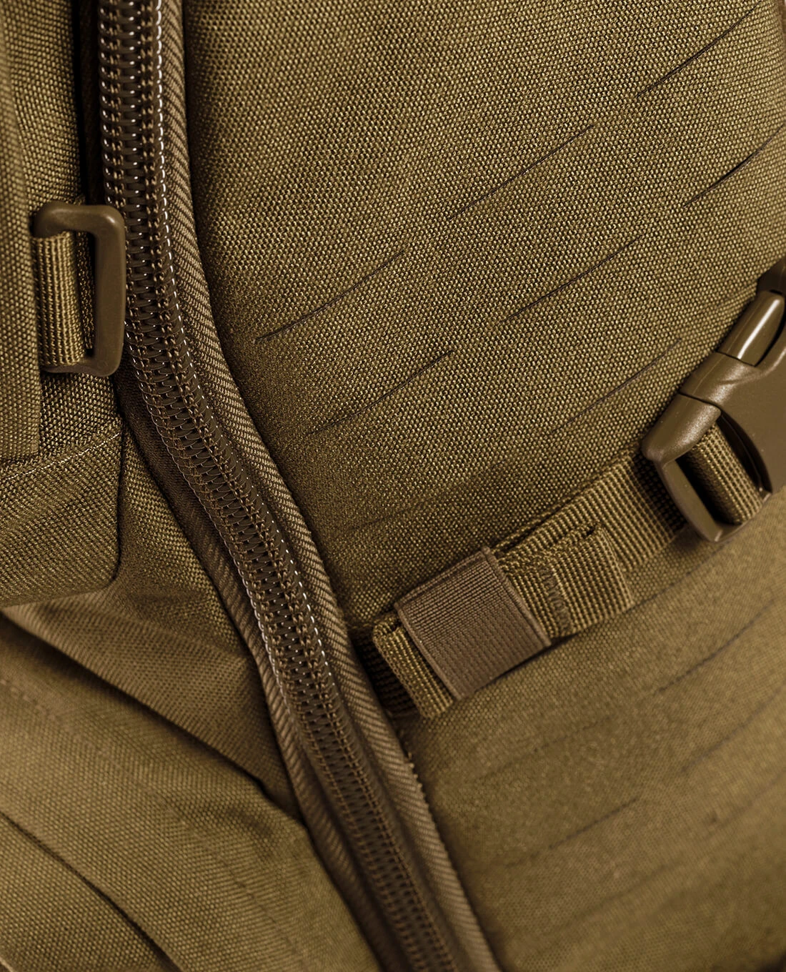 Die beiden Taschen auf der Front des Daypacks fassen 2 Liter (oben) und 3 Liter (unten). Beide sind Reißverschlusstaschen mit M.O.L.L.E.-System in Lasercut-Ausführung auf der Oberseite. Weil auch die Seiten des Rucksacks mit M.O.L.L.E. in Lasercut Design ausgestattet ist, bleibt die Oberfläche des gesamten Rucksacks flach im Profil und maximal variabel in den Optionen: Was auch immer fehlt oder kombiniert werden soll, es wird einfach an den M.O.L.L.E.-Schlitzen angebracht. Und weil der Combat Pack aus CORDURA 700 den gefertigt ist, muss man bei der Beladung auch nicht zimperlich sein, denn das Material ist bekanntlich für seine robuste Struktur und Langlebigkeit bekannt. Sollte der Rucksack übrigens einmal nicht voll beladen sein, dann kann er in der Größe komprimiert werden: Kompressionsriemen an den Seiten werden zusammengezogen und verringern so das Packmaß. Die elastischen Einschubtaschen an den Seiten können trotzdem benutzt werden.