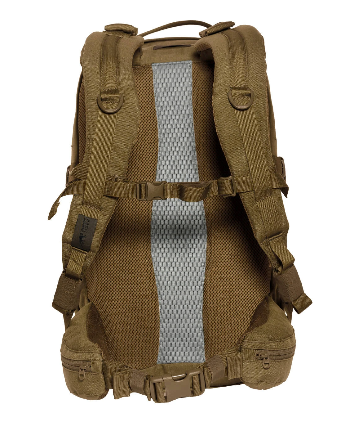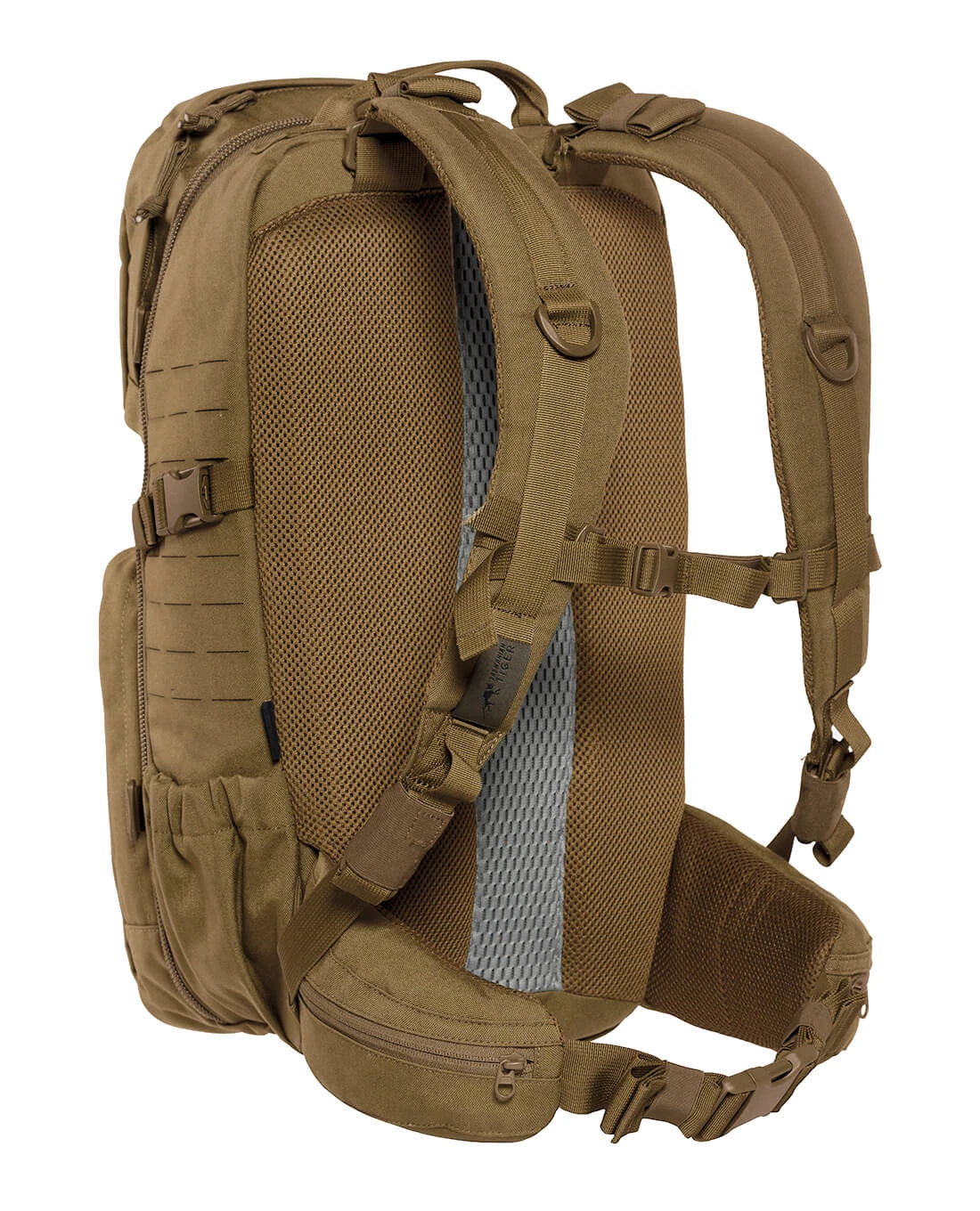 Ein Rucksack voller Möglichkeiten braucht aber vor allem eines: Einen exzellenten Tragekomfort. Auch hier hat Tasmanian Tiger auf Bewährtes gesetzt und sein TT Padded Back Tragesystem zum Einsatz gebracht. Das Tragesystem, das sich in vielen Jahren und vielen taktischen Rucksäcken bewiesen hat, ist eine smarte Kombination aus Rückenteil, Schultergurten und Hüftflossen. In wenigen Worten funktioniert dies folgendermaßen: Der ergonomisch gepolsterte Rücken sorgt für eine Grundstabilität des Rucksacks, die durch das vorgeformte Aluprofil mit eingeschobener Formleiste buchstäblichen Rückhalt gibt. Diese Stabilität nun, die natürlich die Bewegungsfreiheit nicht beeinträchtigt, wird auf das Schultertragesystem übertragen.