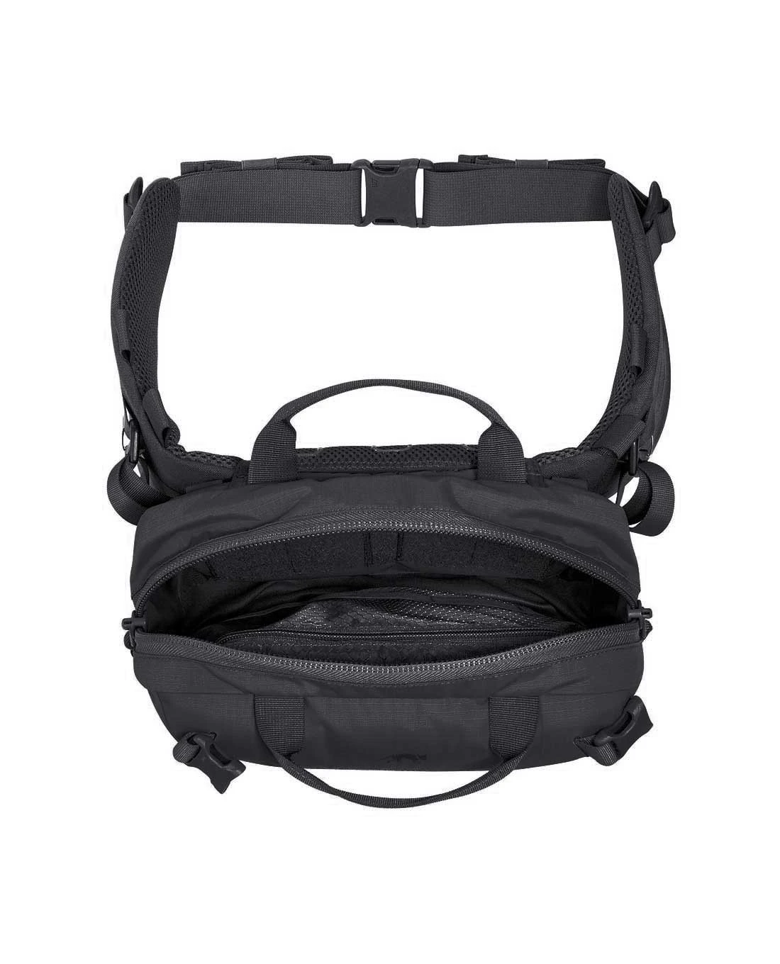 Die Tasche selbst ist mit 22 x 27 x 8 cm und einem Volumen von 5 Litern eine recht große Hüfttasche. Das Gesamtvolumen verteilt sich auf das große Hauptfach mit großen Klett- und M.O.L.L.E Klettflächen im Inneren und zwei Reißverschlussfächern vorne und hinten. Im hinteren Reißverschlussfach ist eine Netz-Tasche ergänzt, in der Kleinteile gut sichtbar und gut erreichbar eingesteckt werden können.