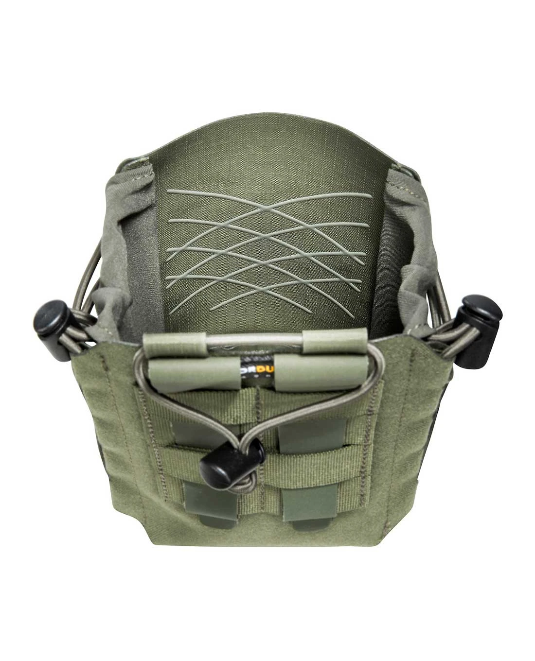 Die Tasche ist aus Cordura 700 den / T-Stretch gefertigt und wird mit einem umlaufenden Kordelzug und elastischen Einsätzen an den Seiten komprimiert und damit sicher festgehalten. Ein simpler Kordelzugverschluss wird um den Flaschenhals gelegt, so dass die Flasche auch nach oben nicht herausrutschen kann.