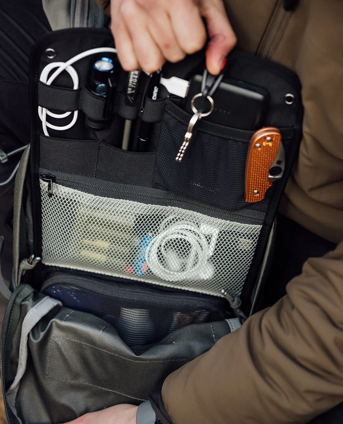 Nun waren die meisten von uns ja lange genug im Home Office um zu wissen, dass gute Organisation wichtig ist, um den Tag zu überstehen. In diesem Sinne lieben wir das TT Organizer Panel, weil es nämlich nicht nur in den TT Essential Pack L passt – dafür wurde der flache Organizer entworfen – sondern weil es auch im Home Office alle Kleinteile beisammen hält und sich nach getaner Arbeit schnell wegräumen lässt. Mit den Maßen 13 x 8 cm nimmt das Fach wirklich kaum Platz weg. Es passt übrigens nicht nur in den Essential Pack L, sondern natürlich auch in andere Rucksäcke der gleichen Größenordnung.