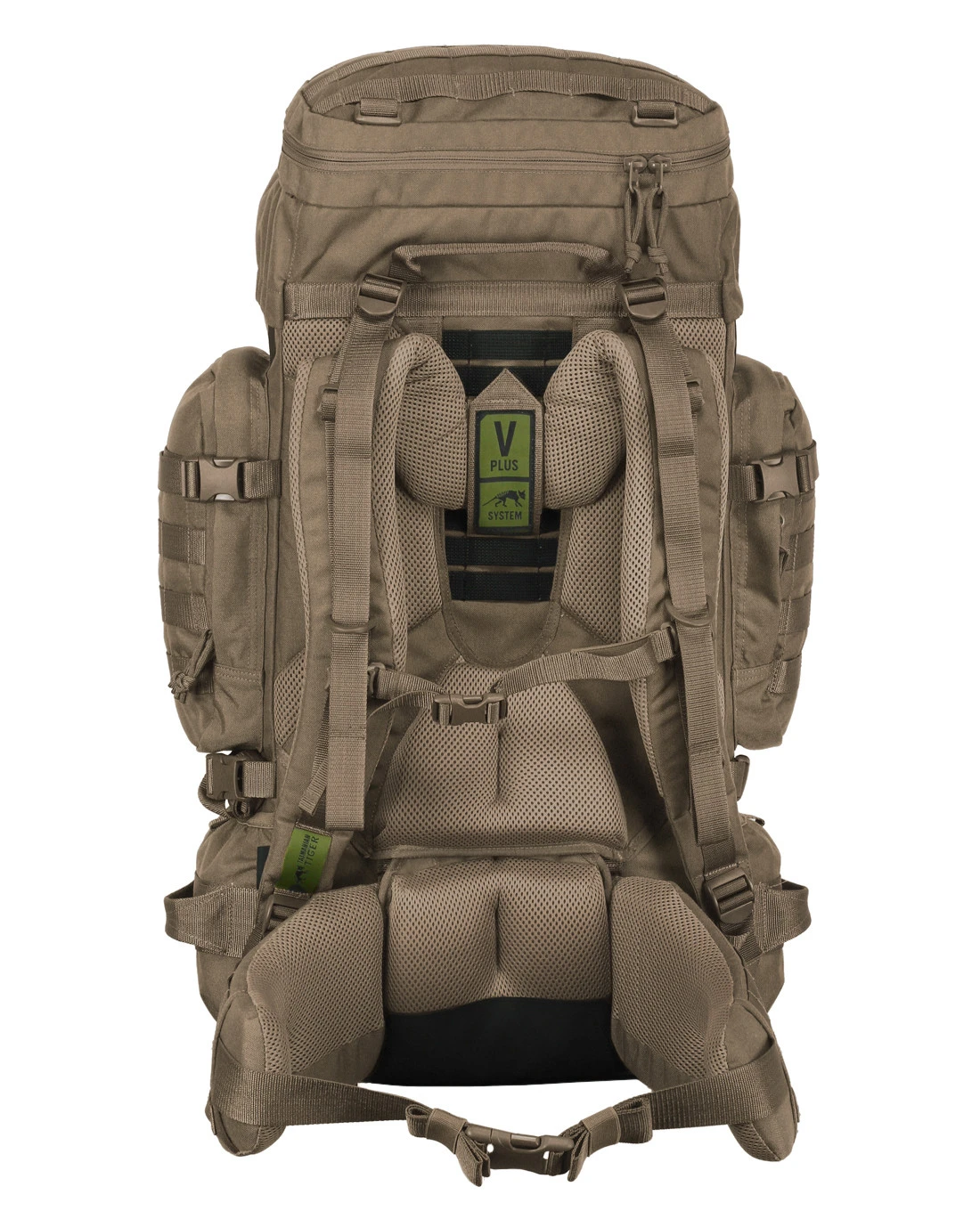 Durch die V-förmige Aluminium-Konstruktion des V2 Plus Tragesystems wird ein Großteil der Traglast auf den Hüftgurt geleitet, was zu einer Entlastung von Schultern und Rücken führt. Der Hüftgurt ist nicht nur großzügig gepolstert, sondern verfügt außerdem über ein Lendenpolster mit gummiertem Einsatz, um ein Verrutschen des Raid Packs zu verhindern und so für bestmöglichen Halt zu sorgen. Da er abnehmbar und rundum mit dem M.O.L.L.E-System ausgestattet ist, kann er auch einzeln als Warrior Belt genutzt werden.