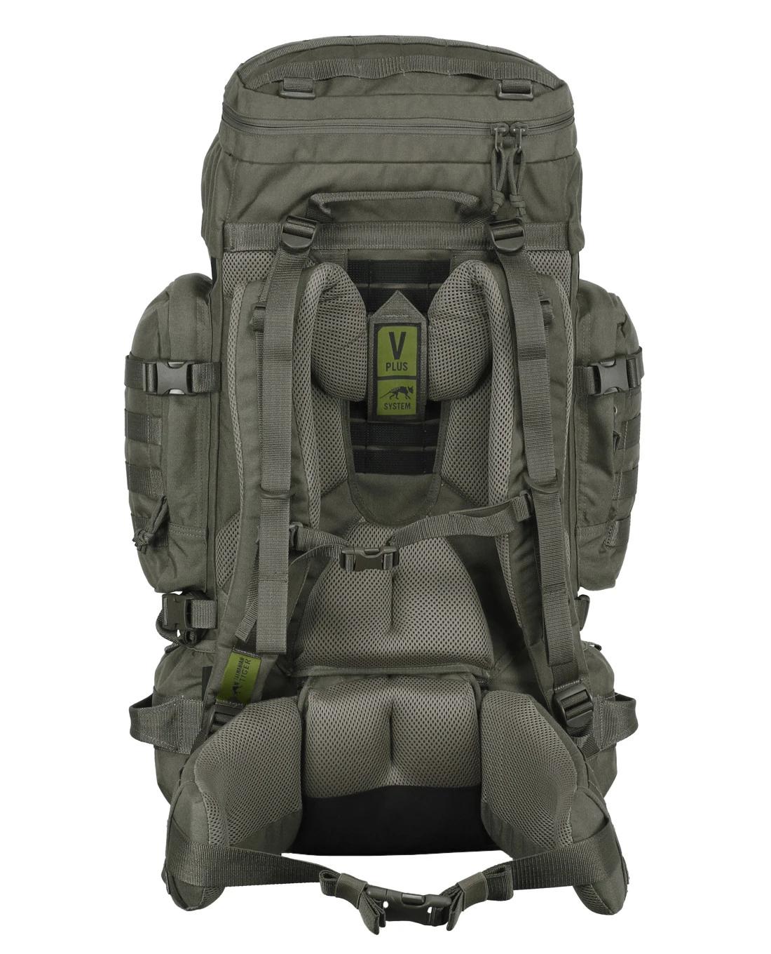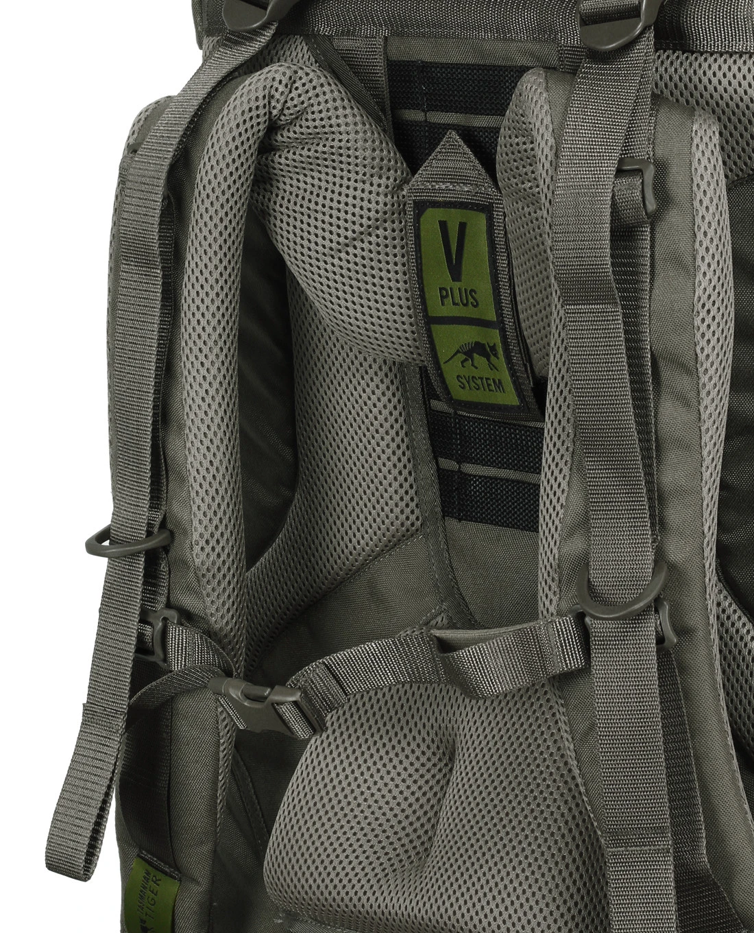 Um Schultern und Rücken beim Tragen des TT Raid Pack MKIII weitestgehend zu entlasten, hat Tasmanian Tiger mit dem V2 Plus Tragesystem eine Konstruktion entworfen, bei der durch V-förmig angelegte Aluminium-Streben im Rückenteil des Rucksacks ein Großteil der Traglast auf den außerordentlich gut gepolsterten Hüftgurt umgeleitet wird. Der Hüftgurt verhindert außerdem durch einen gummierten Einsatz im Lendenpolster ein Verrutschen und sorgt so für bestmöglichen Halt. Als besonderes Highlight lässt sich der Hüftgurt abnehmen und durch die Ausstattung mit M.O.L.L.E-Schlaufen auf der Außenseite kann er problemlos auch einzeln als Warrior Belt genutzt werden. Eine optimale Belüftung wird durch speziell angeordnete Rückenpolster aus Mesh garantiert und verstellbare Schultergurte sowie ein zusätzlicher Brustgurt bieten weitere individuelle Einstellungsmöglichkeiten.