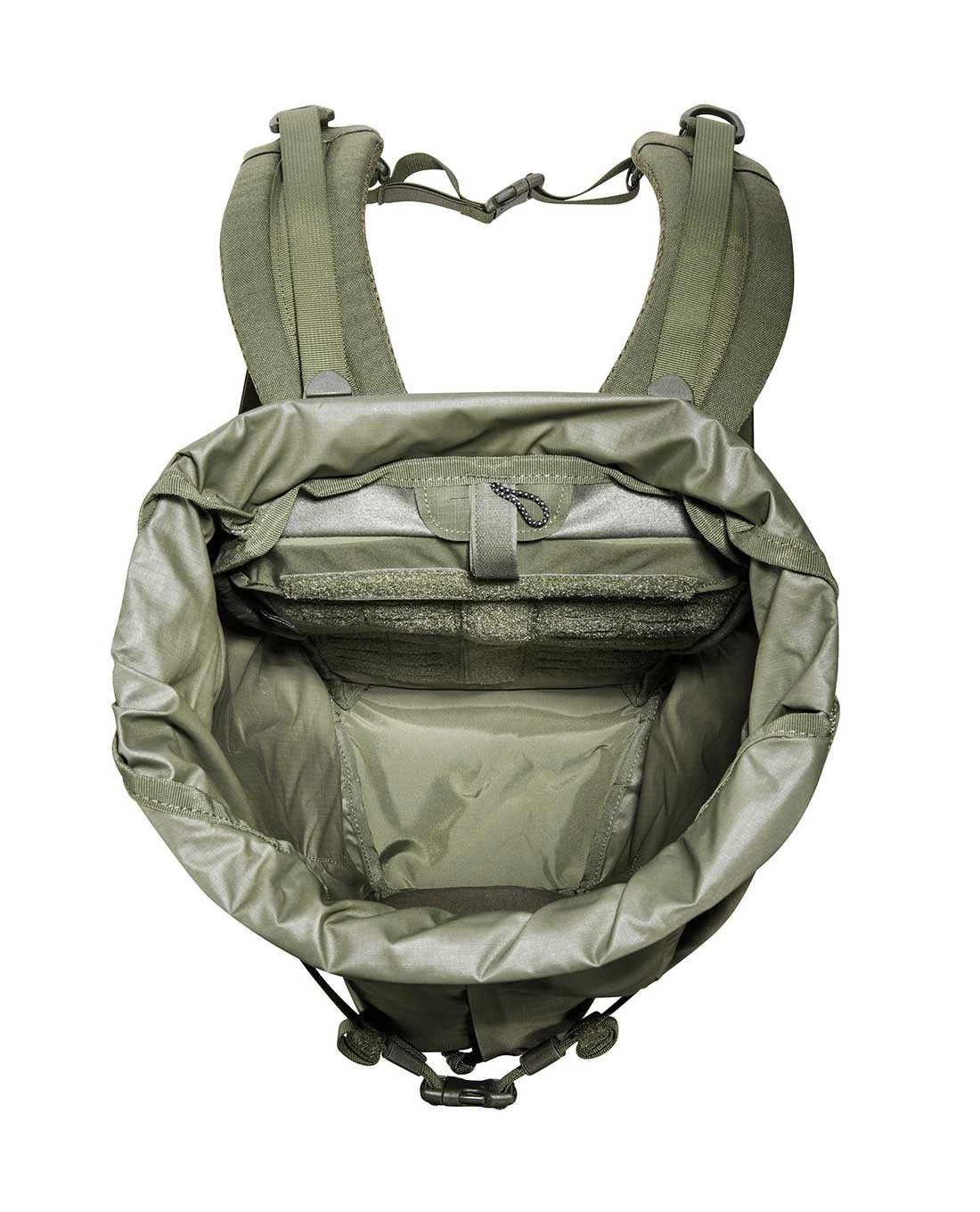 Wird allerdings mehr Packraum benötigt und der Rucksack voll ausgenutzt, so können an den Lasercut-M.O.L.L.E Schlotzen an den Seiten sowie auf Hüft- und Schultergurten Pouches und kleine Ausrüstungsteile angebracht werden und der Rucksack quasi zu einem voll funktionsfähigen Einsatzrucksack umfunktioniert werden. Auch im Inneren des Hauptfachs ist ein M.O.L.L.E-Klett für die modulare Erweiterung angebracht. Selbstverständlich fehlen auch Trinksystemvorbereitung und Kabel-Durchlässe am Hauptfach nicht. Für schnell zugängliche Dokumente, Schlüssel oder EDC-Teile bietet die Fronttasche mit senkrechtem Reißverschluss eine schnelle Verstaumöglichkeit.