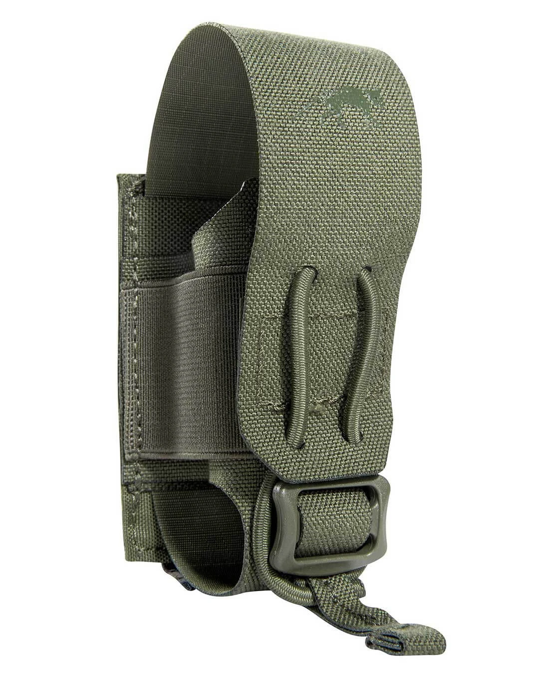 Die kleine und robuste Zubehörtasche enttäuscht nicht in Sachen Widerstandsfähigkeit und ist vor allem unkompliziert und leise zu öffnen: Ohne Ziehen und Zerren wird die Flashbang mit einer Ausziehhilfe aus der Tasche geschoben. Dennoch sitzt sie sicher und fest beim Transport, denn ein Bungee-Cord sorgt mit elastischem Halt für die nötige Sicherheit. Die kleine Pouch mit einer M.O.L.L.E.-Schlaufe befestigt.