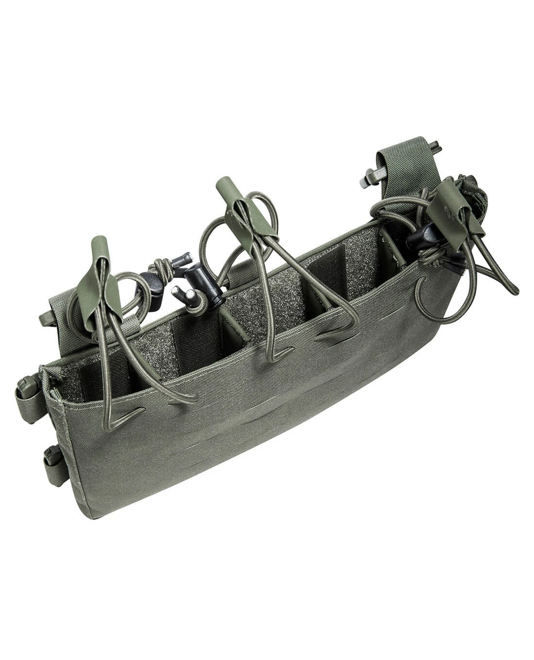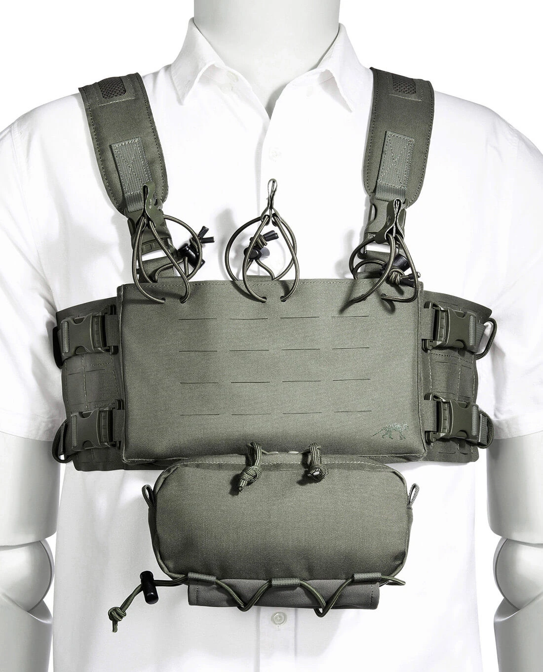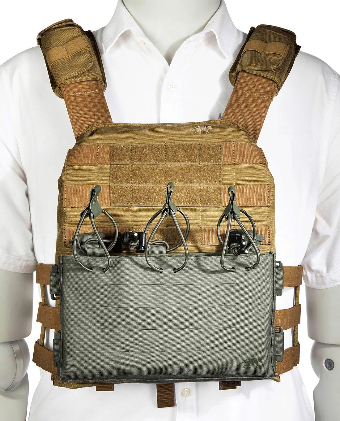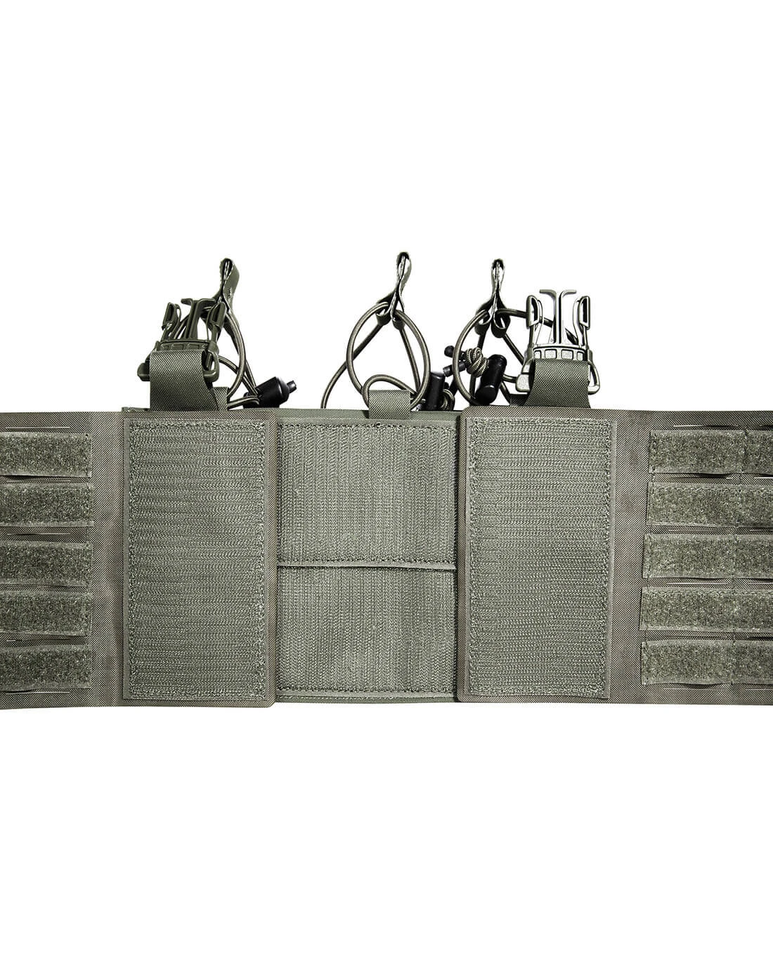 Mit einem Gewicht von 710g ist das Gurtzeug nicht nur leicht, sondern auch flexibel zu nutzen. DIe flachen, gepolsterten Träger übertragen das Gewicht optimal und sind in der Länge verstellbar. Der Front-Teil des Combi Rig wird von einem abklettbaren Magazinmodul eingenommen, das auf Plattenträgern genutzt werden kann. Die Magazineinsätze sind dabei austauschbar und passen für 3 x M4 (PMAG)-Magazine (50 g) oder 4 x Pistolen-/ MP7-Magazine (40 g). Auf dem Magazinmodul befindet sich zur weiteren Verwendung mit Zubehörtaschen oder anderen kleinteilen das M.O.L.L.E.-System in Laser Cut-Ausführung. Die Rückseite des Front-Teils wird von einer abgedeckten Klett-Fläche eingenommen, die als Front Flap für den Plattenträger benutzt werden kann. Auch die Zubehörtasche (ähnlich der TT Tac Pouch 12) und die MOLLE-Seitenflügel, beide am Front-Teil angeschlossen, können abgenommen werden. Die beiden Seitenflügel verfügen auch wiederum über ein Lasercut-MOLLE-System und sind gut für Magazine oder kleine Zubehörtaschen geeignet.