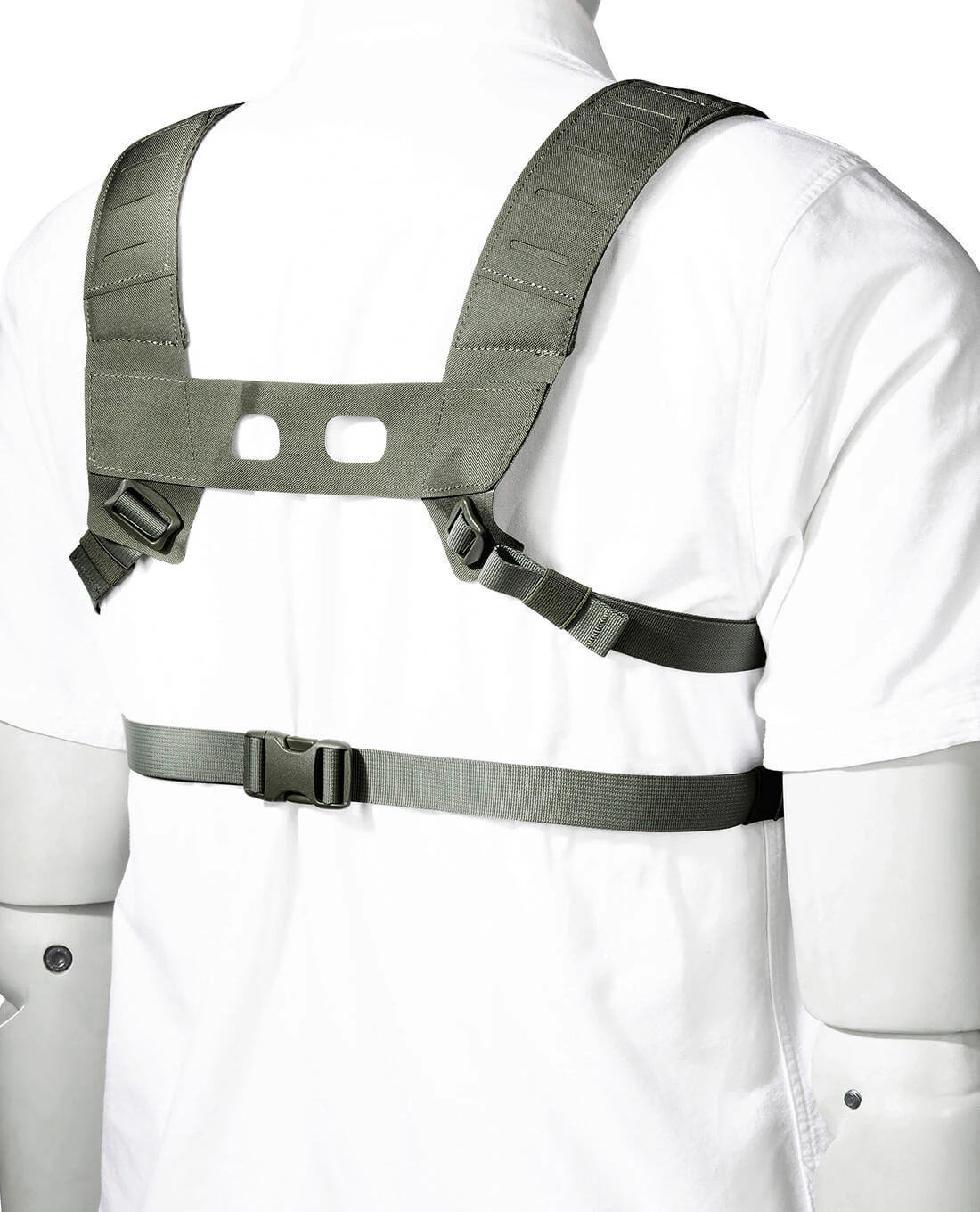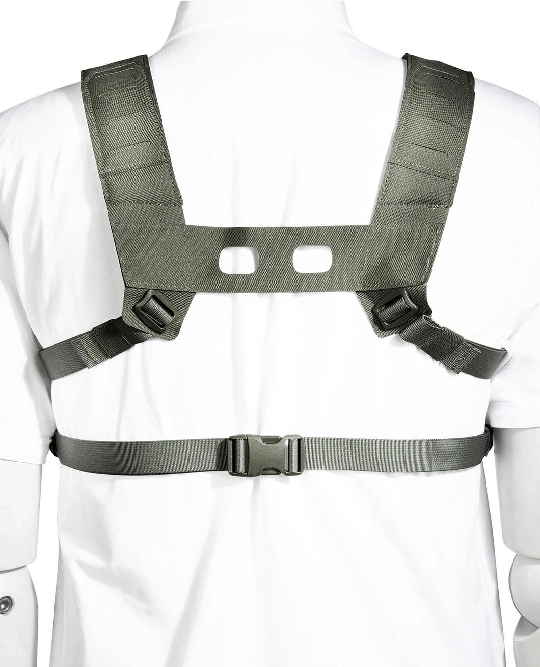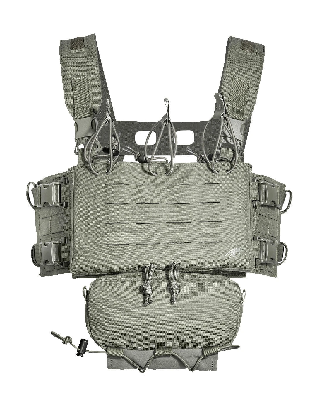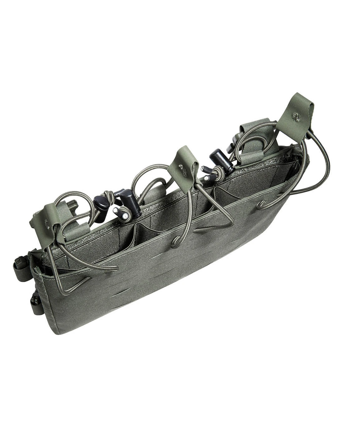 Mit einem Gewicht von 710g ist das Gurtzeug nicht nur leicht, sondern auch flexibel zu nutzen. DIe flachen, gepolsterten Träger übertragen das Gewicht optimal und sind in der Länge verstellbar. Der Front-Teil des Combi Rig wird von einem abklettbaren Magazinmodul eingenommen, das auf Plattenträgern genutzt werden kann. Die Magazineinsätze sind dabei austauschbar und passen für 3 x M4 (PMAG)-Magazine (50 g) oder 4 x Pistolen-/ MP7-Magazine (40 g). Auf dem Magazinmodul befindet sich zur weiteren Verwendung mit Zubehörtaschen oder anderen kleinteilen das M.O.L.L.E.-System in Laser Cut-Ausführung. Die Rückseite des Front-Teils wird von einer abgedeckten Klett-Fläche eingenommen, die als Front Flap für den Plattenträger benutzt werden kann. Auch die Zubehörtasche (ähnlich der TT Tac Pouch 12) und die MOLLE-Seitenflügel, beide am Front-Teil angeschlossen, können abgenommen werden. Die beiden Seitenflügel verfügen auch wiederum über ein Lasercut-MOLLE-System und sind gut für Magazine oder kleine Zubehörtaschen geeignet.