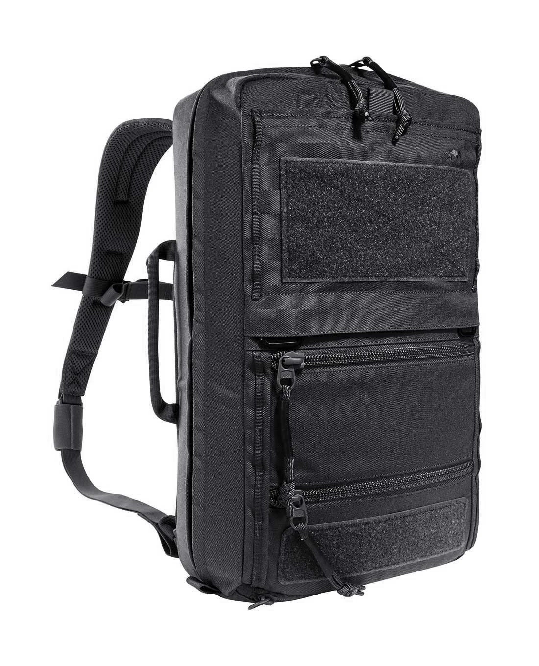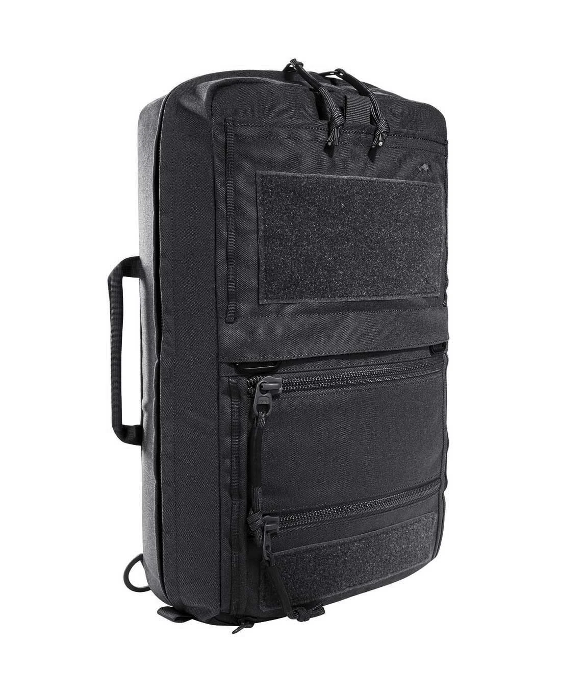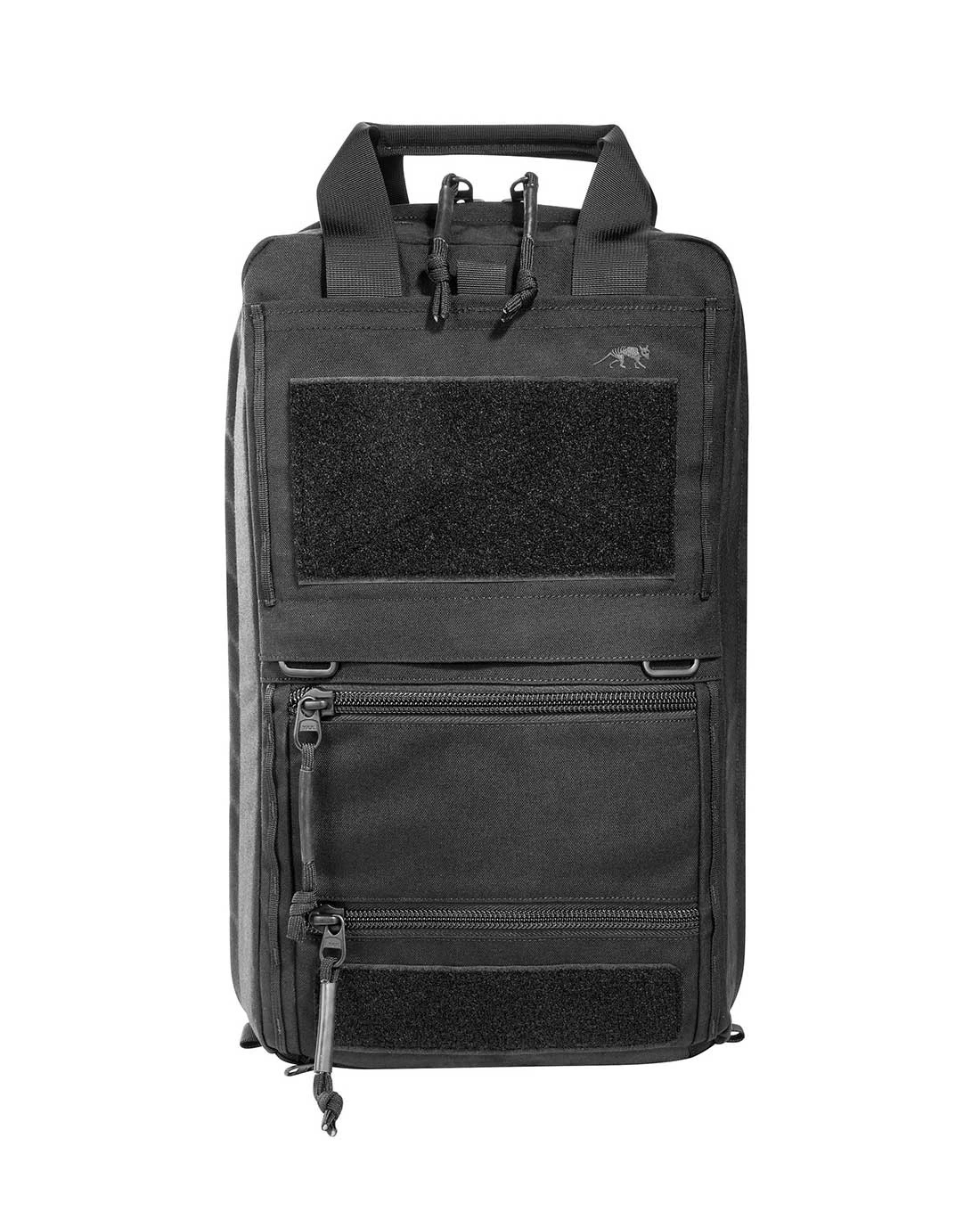 Auf der Außenseite dienen zwei flache Reißverschlussfächer der schnellen Erreichbarkeit von Dokumenten. Zwei Haken auf der Front sind für die Befestigung zusätzlicher Taschen oder Panels vorgesehen. Zwei großen Patchflächen sind zur Bestückung mit ID oder Morale Patches vorhanden.