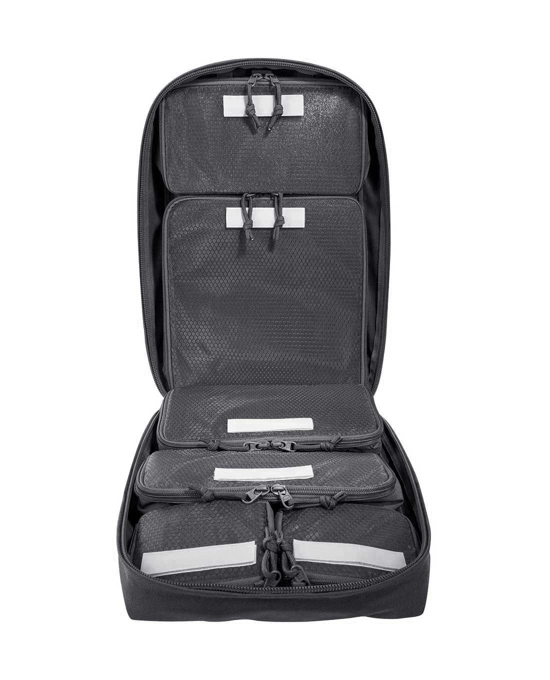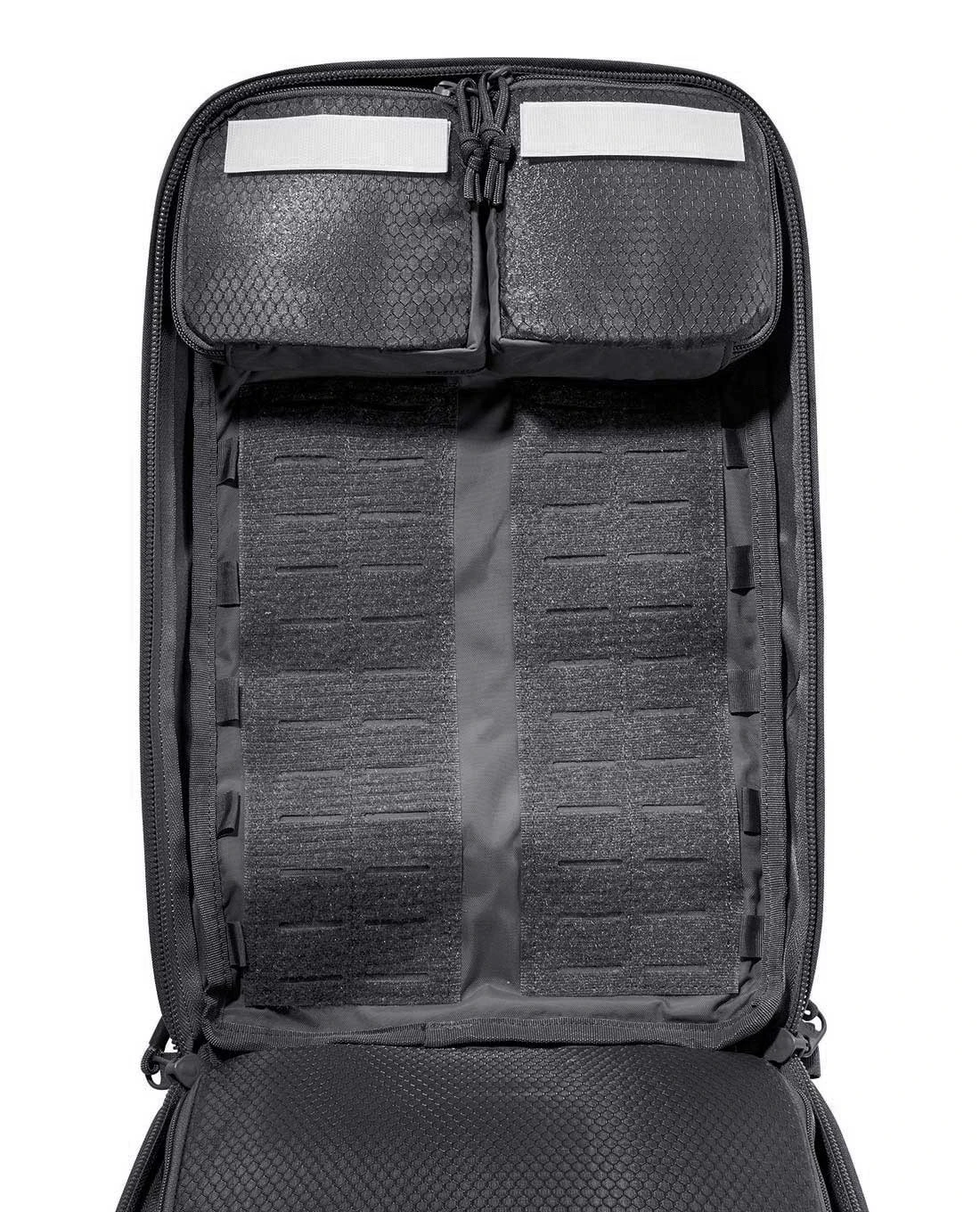 Das Hauptfach ist dank des weit aufziehbaren Reißverschlusses einfach und vollständig zu erreichen. Sechs Taschen mit durchsichtigem Deckel sind hier angebracht, um Kleinteile, EDC, Medikamente etc sinnvoll und übersichtlich zu verstauen. Die Taschen haben unterschiedliche Größen und verpacken Volumen von 0,5 Liter – 6 Liter. Zwei der Taschen können herausgenommen werden. Die Innenseite des Hauptfachs ist außerdem mit einer großzügigen M.O.L.L.E-Klettfläche ausgestattet, so dass der Einsatzrucksack auch mit externen Taschen und Pouches so modular wie möglich gepackt werden kann.