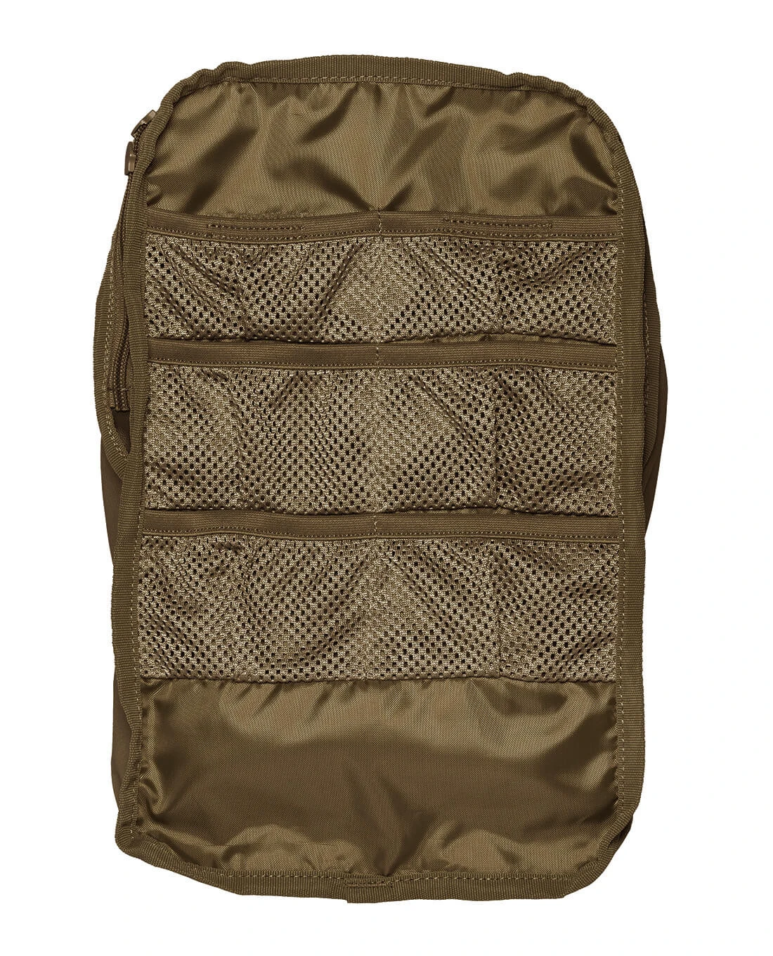 Die Tasche wird aus CORDURA 700 den gefertigt, das sich dank elastischen Materials an den Seiten bei Bedarf praktisch komprimieren lässt. So ist die Tasche je nach der Menge des Inhalts mit dem angebrachten Bungee-Cord flach zusammenzuziehen. Das große Hauptfach ist in kluge Abteile und in verschiedene Aufbewahrungsoptionen unterteilt, so dass es bestmöglich nutzbar ist: Innen befindet sich M.O.L.L.E.-Klett sowie eine Netztasche zur Aufbewahrung von Kleinteilen. Eine Trinksystemvorbereitung ist ebenfalls im Inneren integriert und mit dem notwendigen Ausgang für Schläuche oder auch Antennen ausgestattet. Elastische Schlaufen und Gurtbänder sind weiterhin für die Befestigung von Kleinteilen und insbesondere von medizinischem Equipment vorgesehen. Ein nahezu vollständig umlaufender Reißverschluss und ein weiterer auf der Front erlauben blitzschnellen Zugriff auf alle geführten Komponenten.
