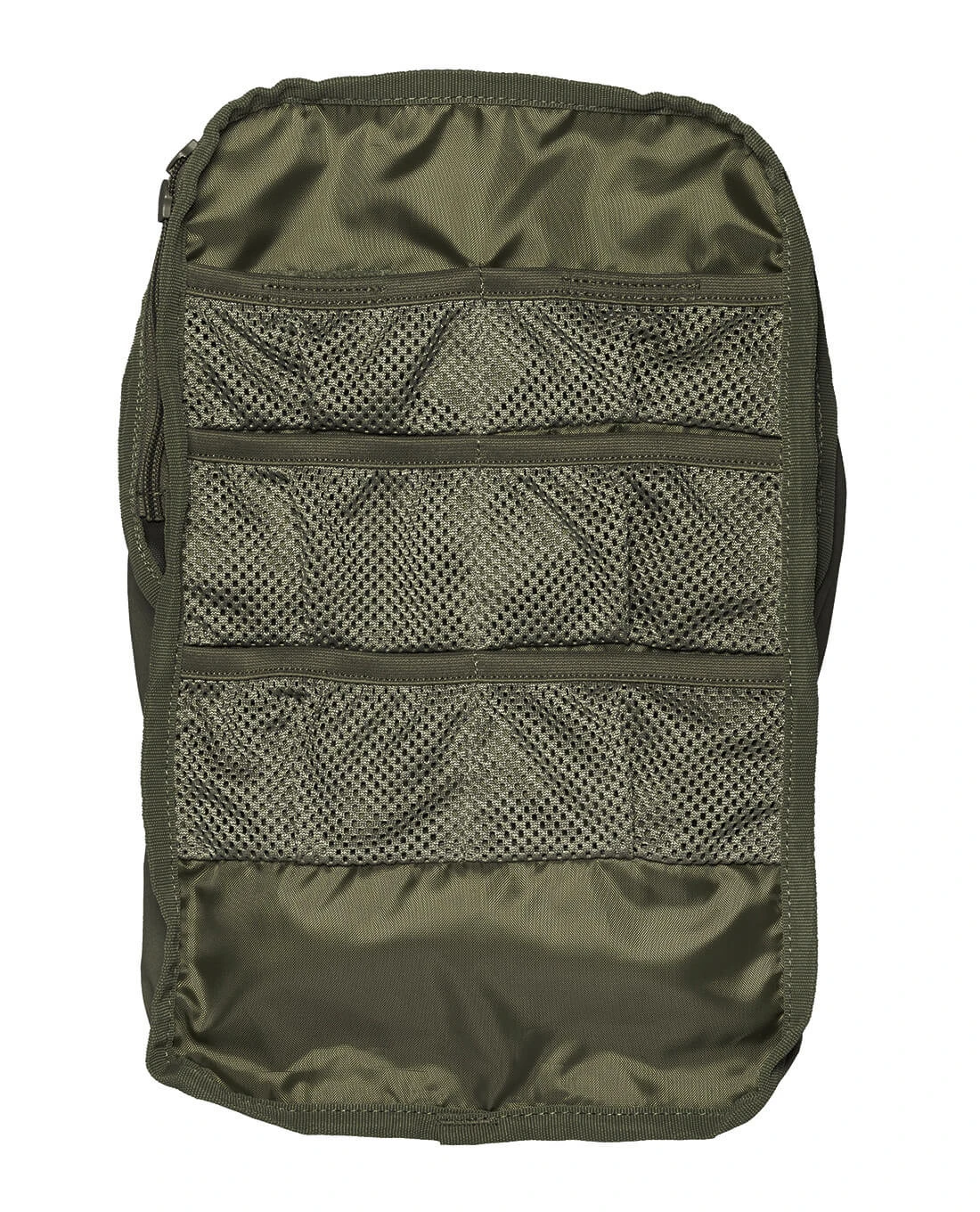 Die Tac Pouch 14 hat die Maße 37 x 22,5 x 10 cm und ein Volumen von 10 Litern. Damit ist schon reichlich Platz, der auch sinnvoll genutzt werden kann. Dank des fast umlaufenden Reißverschlusses kann die Tasche nahezu vollständig aufgeklappt werden. Der vertikale Reißverschluss auf der Frontseite macht ein schnelles Zugreifen auf den Inhalt auch möglich. Eine Trinksystemvorbereitung ist im Inneren integriert und mit dem notwendigen Ausgang versehen. Die Organisation im Inneren kann mit Hilfe verschiedener elastischer Schlaufen, Gurtbänder oder eines M.O.L.L.E.-Kletts erfolgen. Eine durchsichtige Netz-Tasche ist ebenfalls integriert. Da alle Einzelteile gut sichtbar und sicher verstaut werden können, ist die Tac Pouch 14 auch für medizinisches Equipment optimal geeignet. Ist die Tasche einmal nicht gänzlich bepackt, kann sie mittels des angebrachten Bungee-Cords bequem komprimiert werden.
