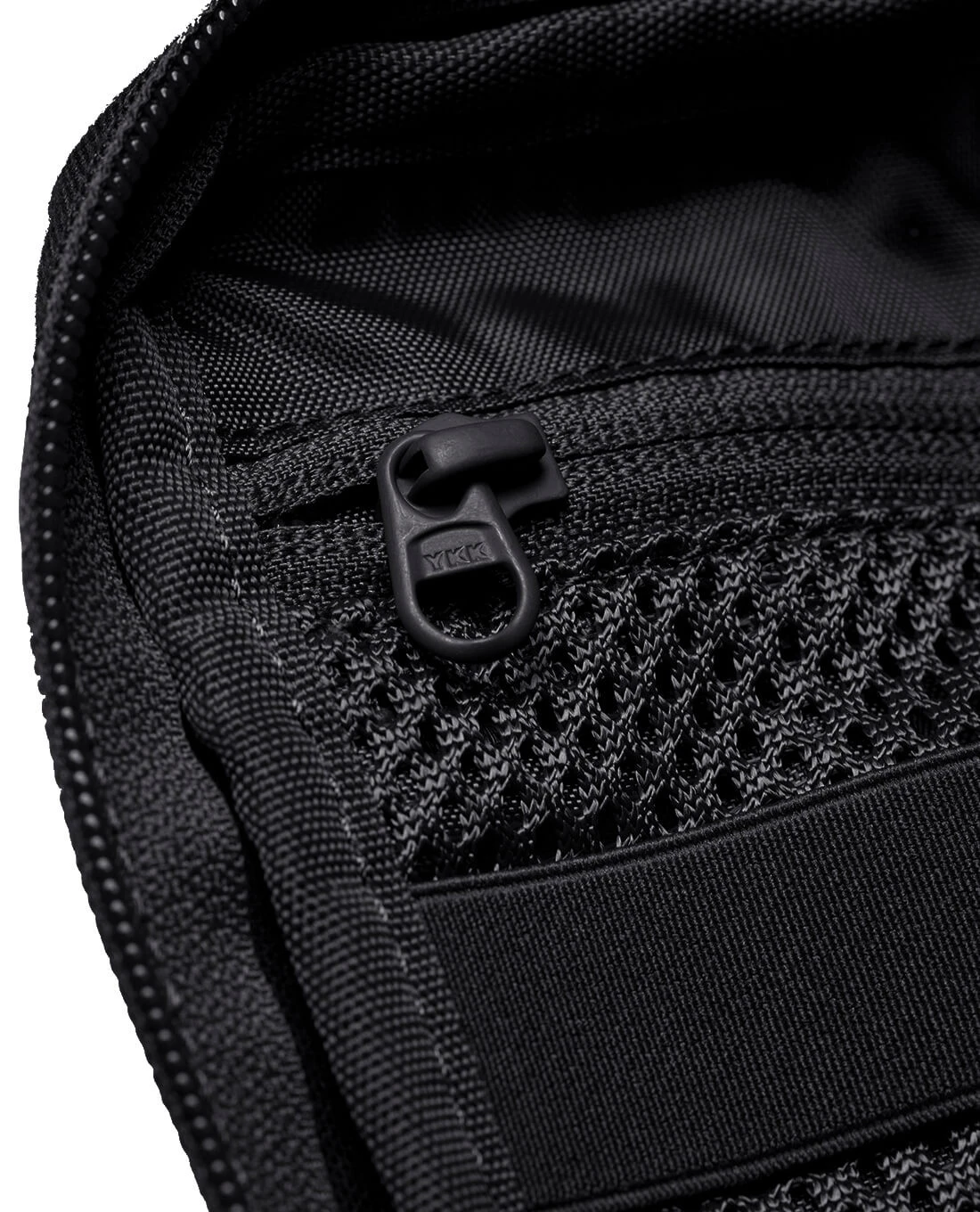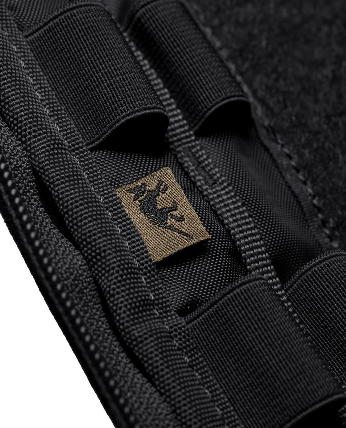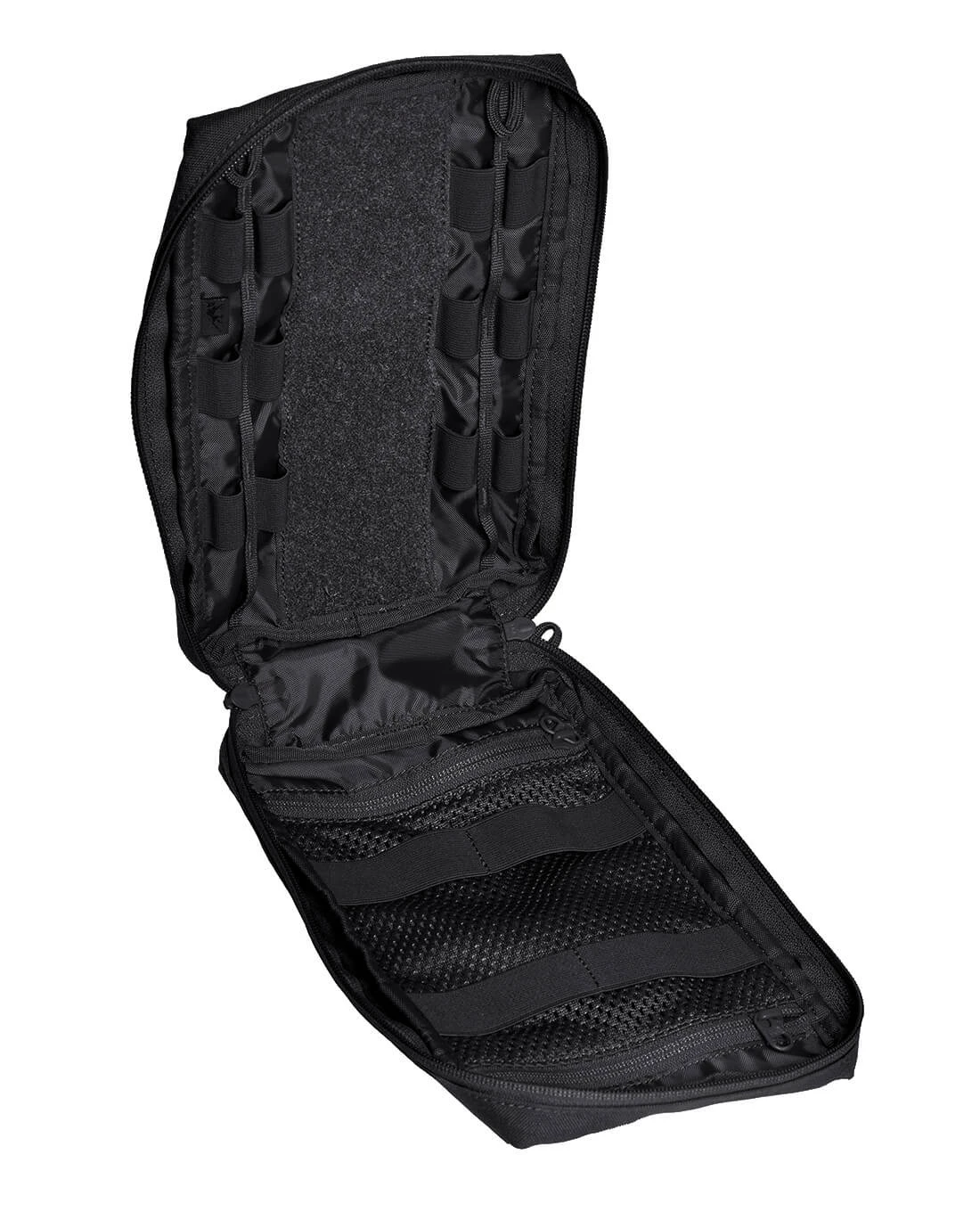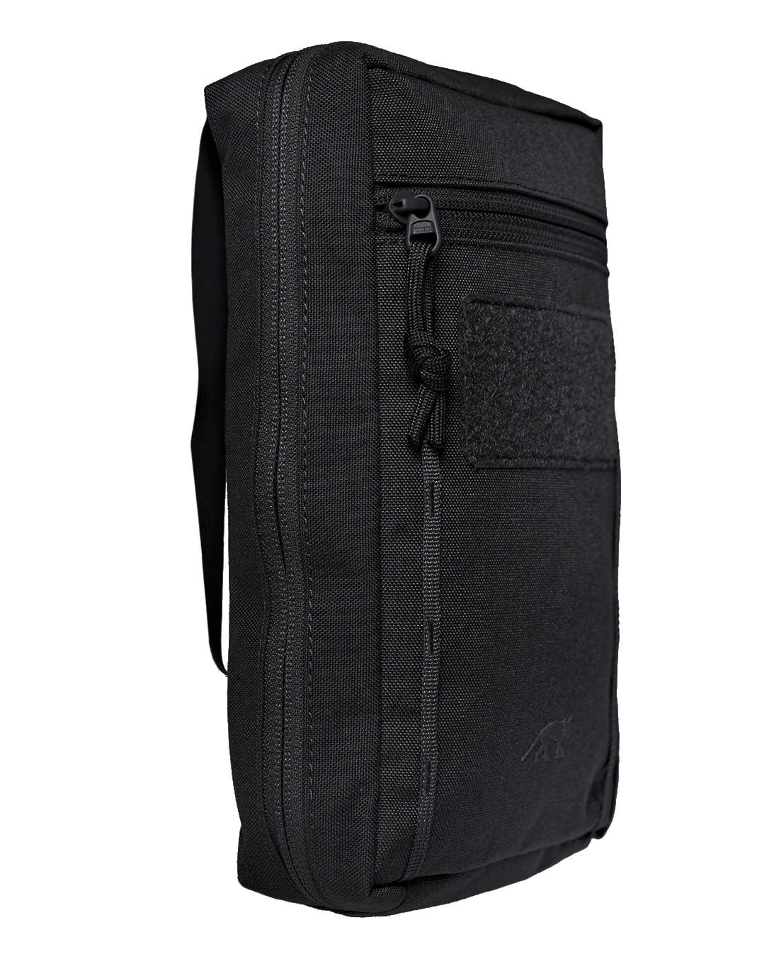 Innen können Kleinteile in der einsehbaren Netztasche organisiert werden. Verschiedene elastische Schlaufen und ein Gurtbandsystem können außerdem zur Befestigung von Kleinteilen benutzt werden. Eine Flauschfläche befindet sich zusätzlich im Inneren, an der kleine Teile oder Patches befestigt werden können. Auf der Vorderseite können Dokumente in einem flachen Reißverschlussfach aufbewahrt werden. Es werden vier M.O.L.L.E.-Schlaufen benötigt, um die Tasche vertikal zu befestigen.