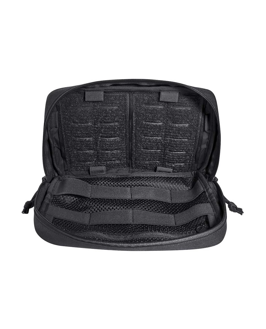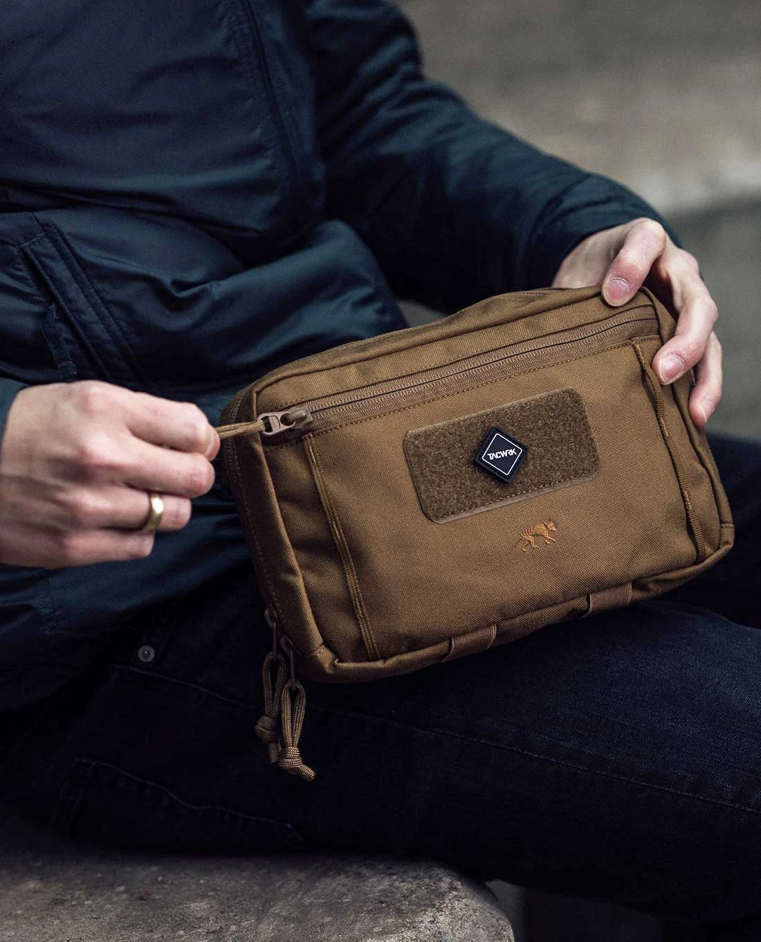 Die Pouch aus Cordura 700 den misst 24 x 16 x 6 cm und hat damit ausreichend Platz für EDC und notwendige Einsatzdetails. Mit einem Haupt-Reißverschluss, der sich weit öffnen lässt, erfolgt der Zugang mühelos und das sortierte Innenleben der Pouch kann gut erreicht werden: Flache Netztaschen, elastische Schlaufen und eine große M.O.L.L.E Klettfläche im Inneren bringen Ordnung in die EDC und fixieren alle Teile sicher an Ort und Stelle. Auf der Front bietet eine Reißverschluss-Tasche extra Platz für schnell erreichbare Dokumente. Eine Flauschklettfläche für Patches ist ebenfalls auf der Vorderseite angebracht und als kleines taktisches Extra können am Boden Knicklichter in den angebrachten elastischen Schlaufen eingesteckt werden.