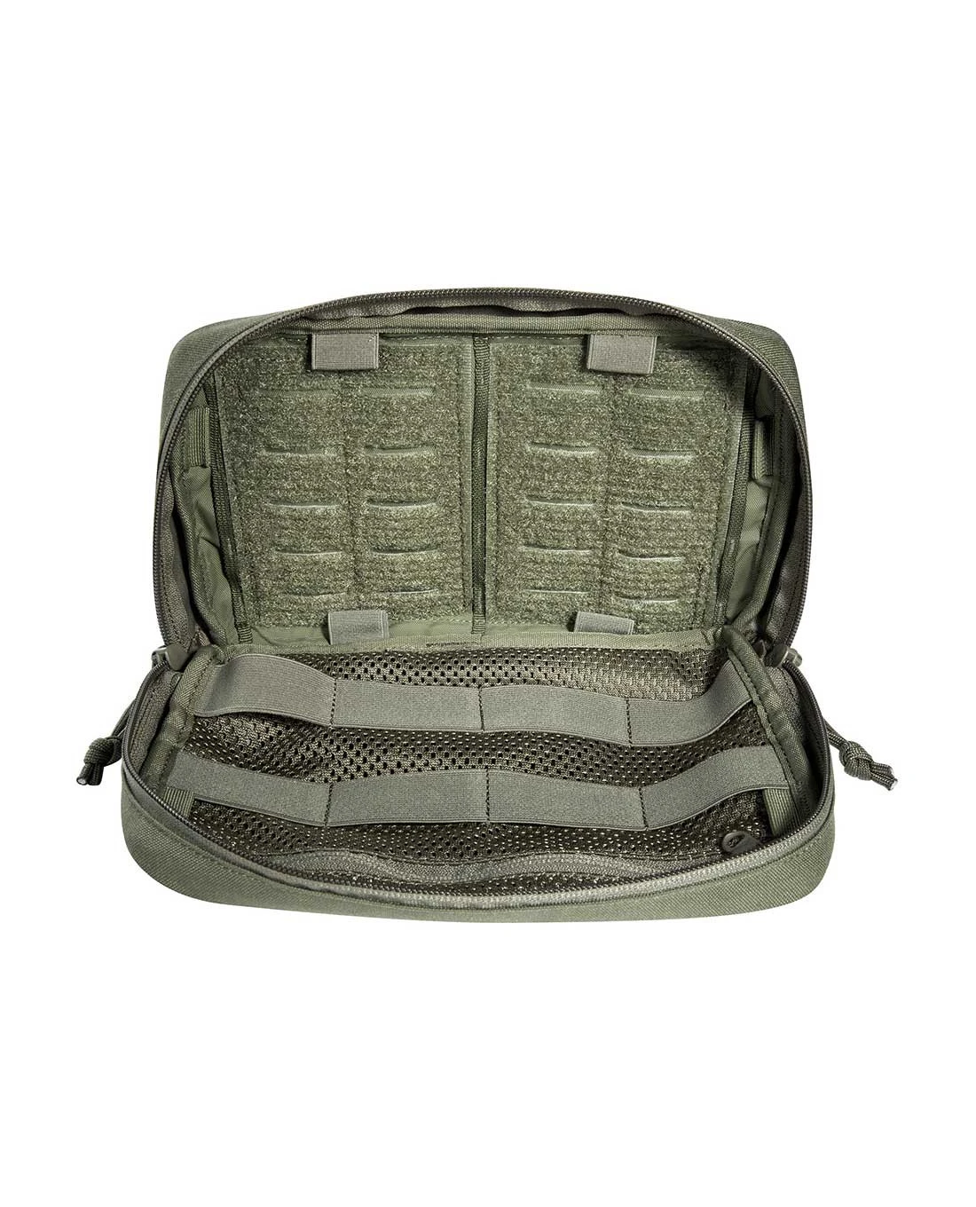 Zur Organisation und Fixierung der Kleinteile und mitgeführten Dokumente sind im Inneren flache Netztaschen, elastische Schlaufen und eine große M.O.L.L.E Klettfläche angebracht. Auf der Front bietet eine Reißverschluss-Tasche zusätzlich Raum. Eine Flauschklettfläche für Patches ist ebenfalls auf der Vorderseite angebracht. Am Boden können in Schlaufen Knicklichter eingeschoben werden.
