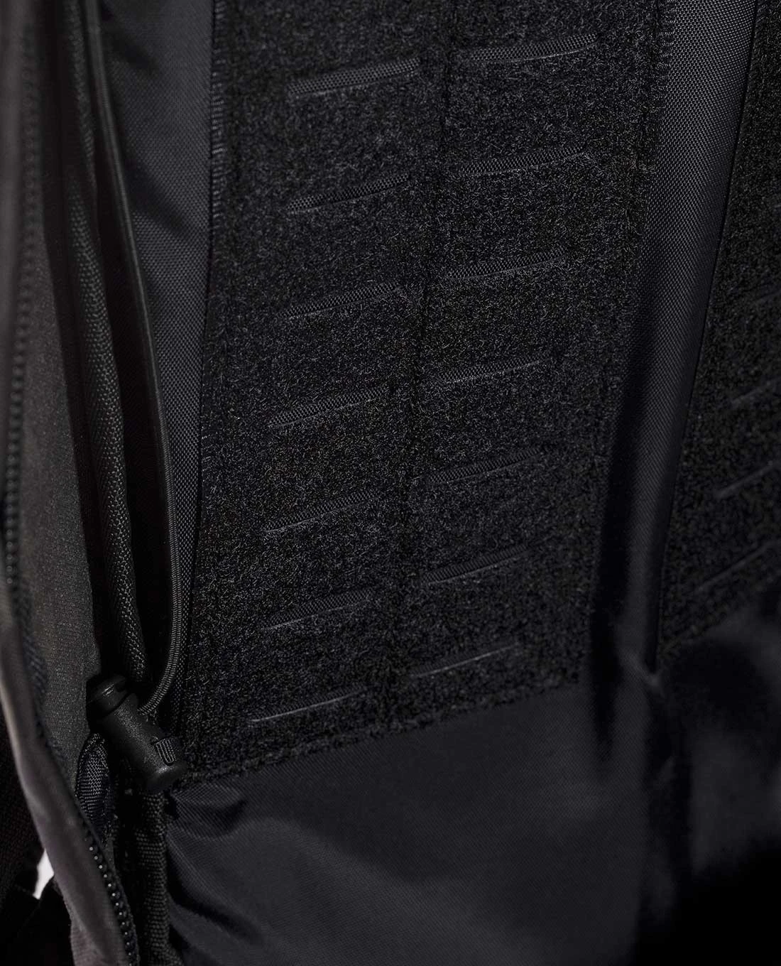 Das Rückenteil zum Ersten ist durch eine anatomisch geformte Kunststoffplatte mit Aluminiumstab stabilisiert und zusätzlich gepolstert. Zum Zweiten sind die ebenfalls gepolsterten Schultergurte für eine gute Gewichtsübertragung eingesetzt, wo sie durch den dünnen und minimalistischen Hüftgurt und den höhenverstellbaren Brustgurt Unterstützung erhalten. Hüft- und Brustgurt können abgenommen werden. Fürs taktische je-ne-sais-quoi sind die Tragegurte mit Lasercut-M.O.L.L.E-Schlitzen versehen.