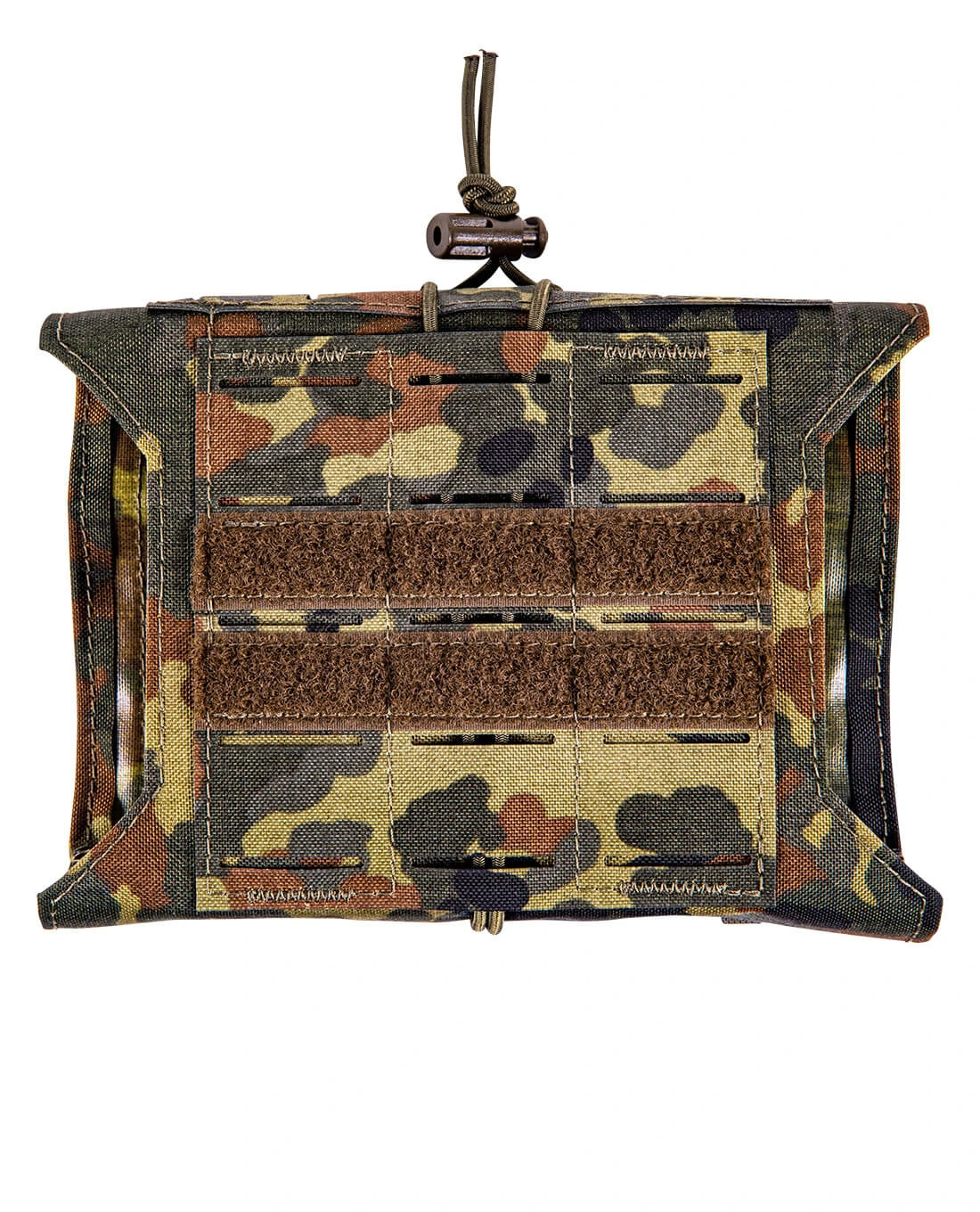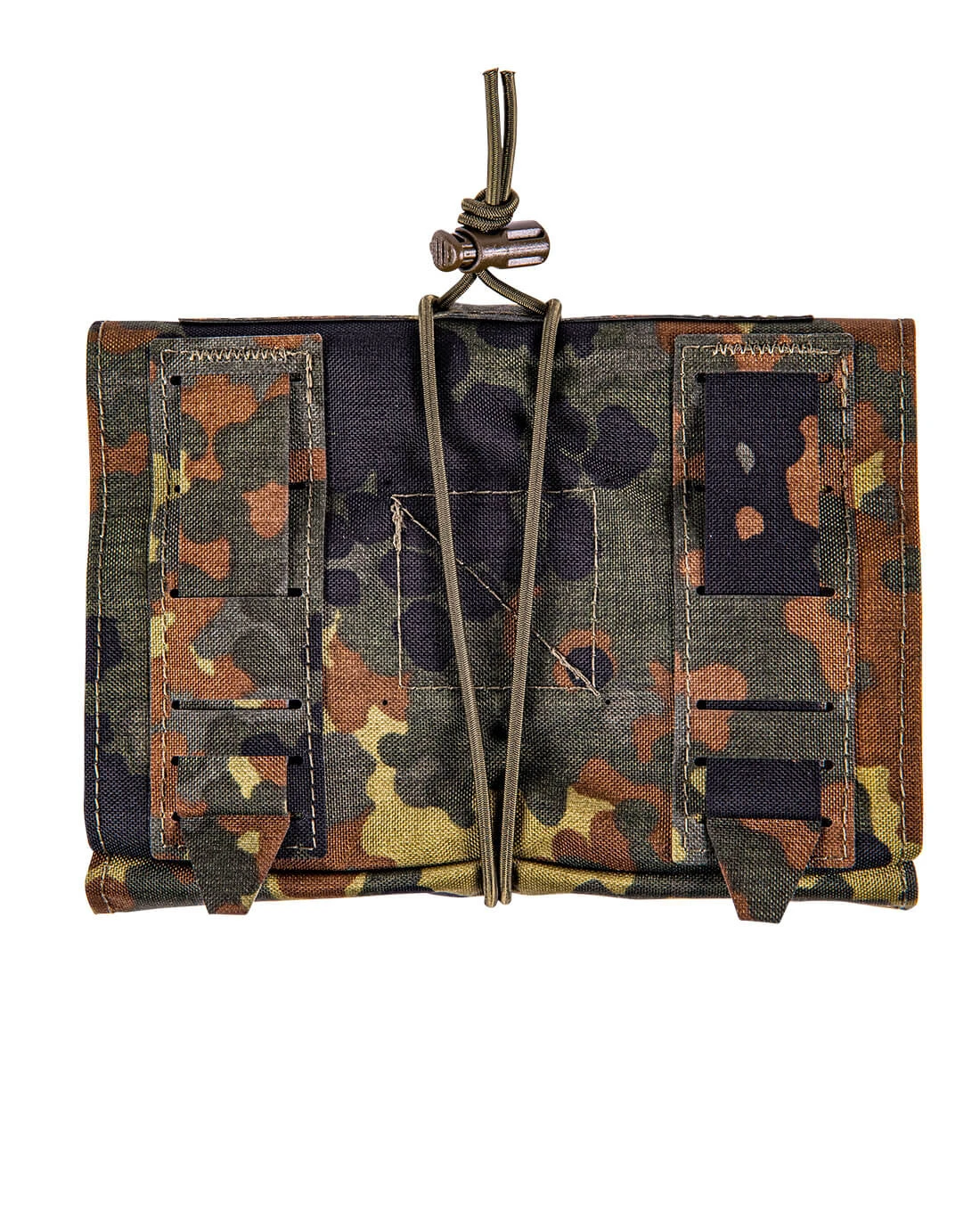 Auf Ober- und Vorderseite finden sich M.O.L.L.E.-Schlaufen im Lasercut Design. Hakenklett auf der Innenseite sorgt für sicheren Halt und optimale Fixierung in Kombination mit der Trauma IFAK Innentasche. Über einen umlaufenden Gummizug lässt sich der Zugwiderstand individuell einstellen und eine 10 x 5 cm große Flauschklettfläche erlaubt das unkomplizierte Anbringen von Kennzeichnungen und Medic Patches.