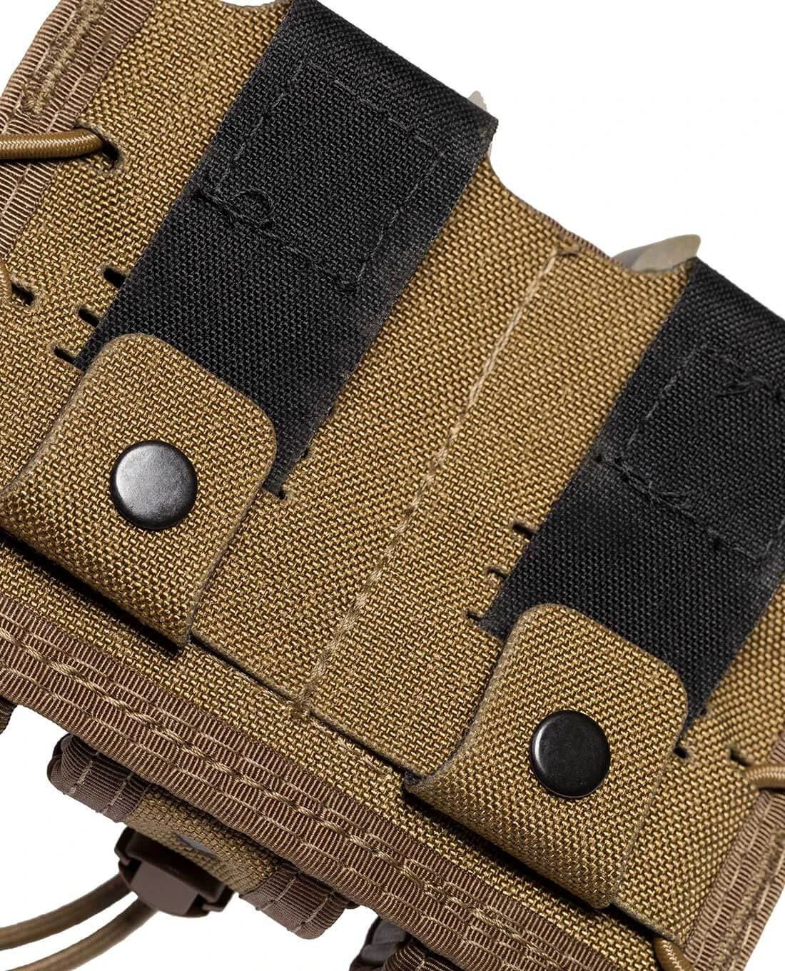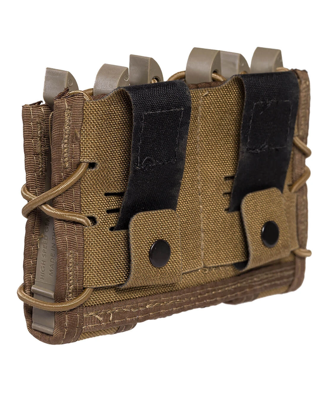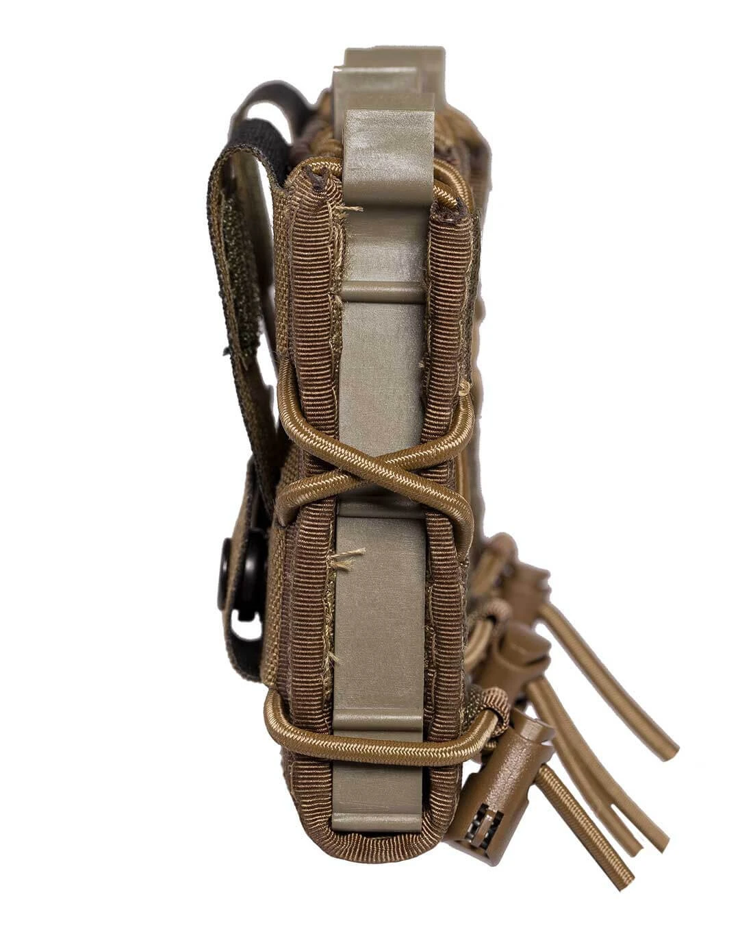 Aufgrund des 100% Nylon und der Komprimierung durch den Gummizug kann eine große Breite an Pistolen-Magazinen aufgenommen werden: 1911, HK 45, M9/Beretta 92, Glock, XD-Magazine werden alle sicher gehalten und bei Bedarf leicht und geräuschlos herausgezogen.