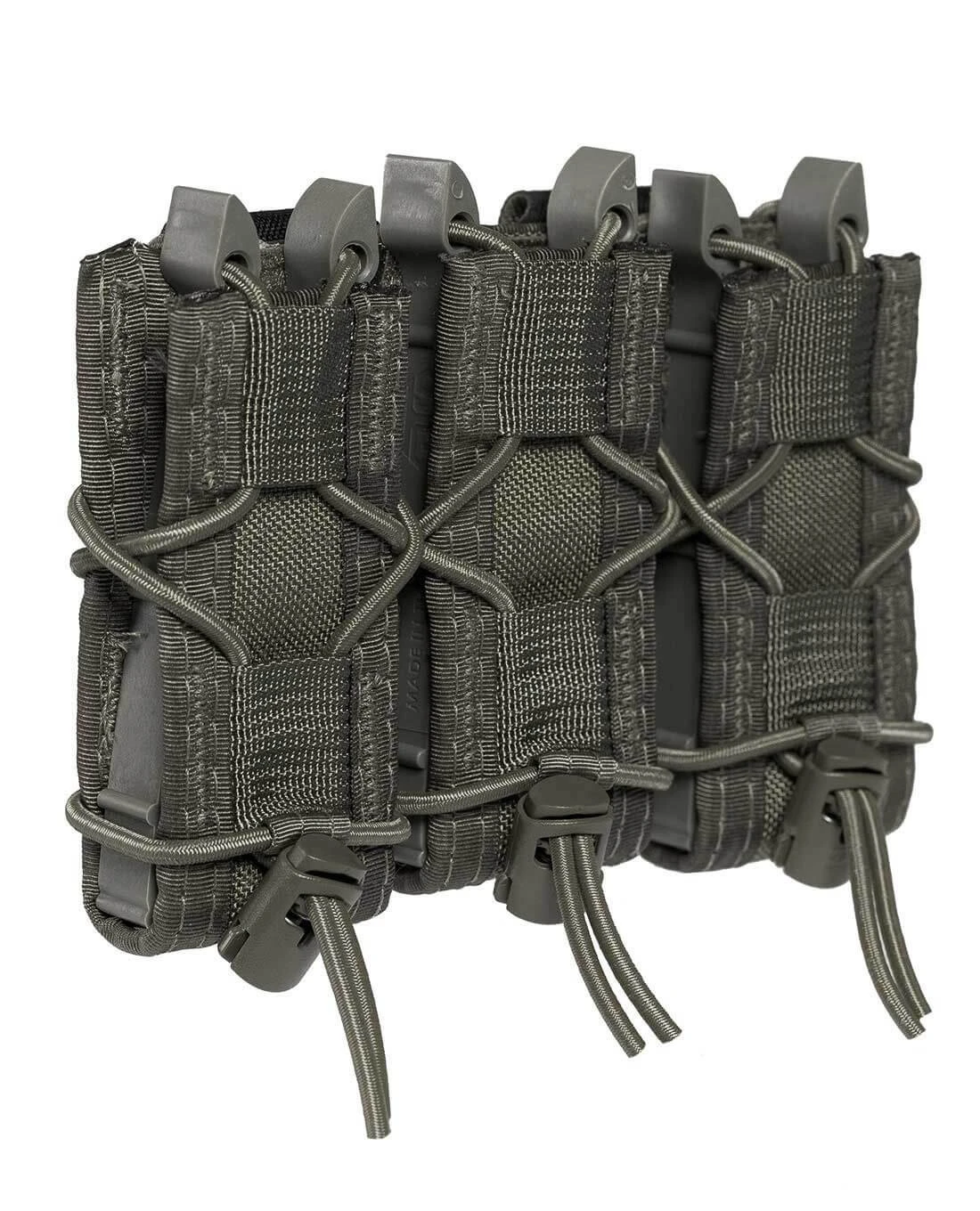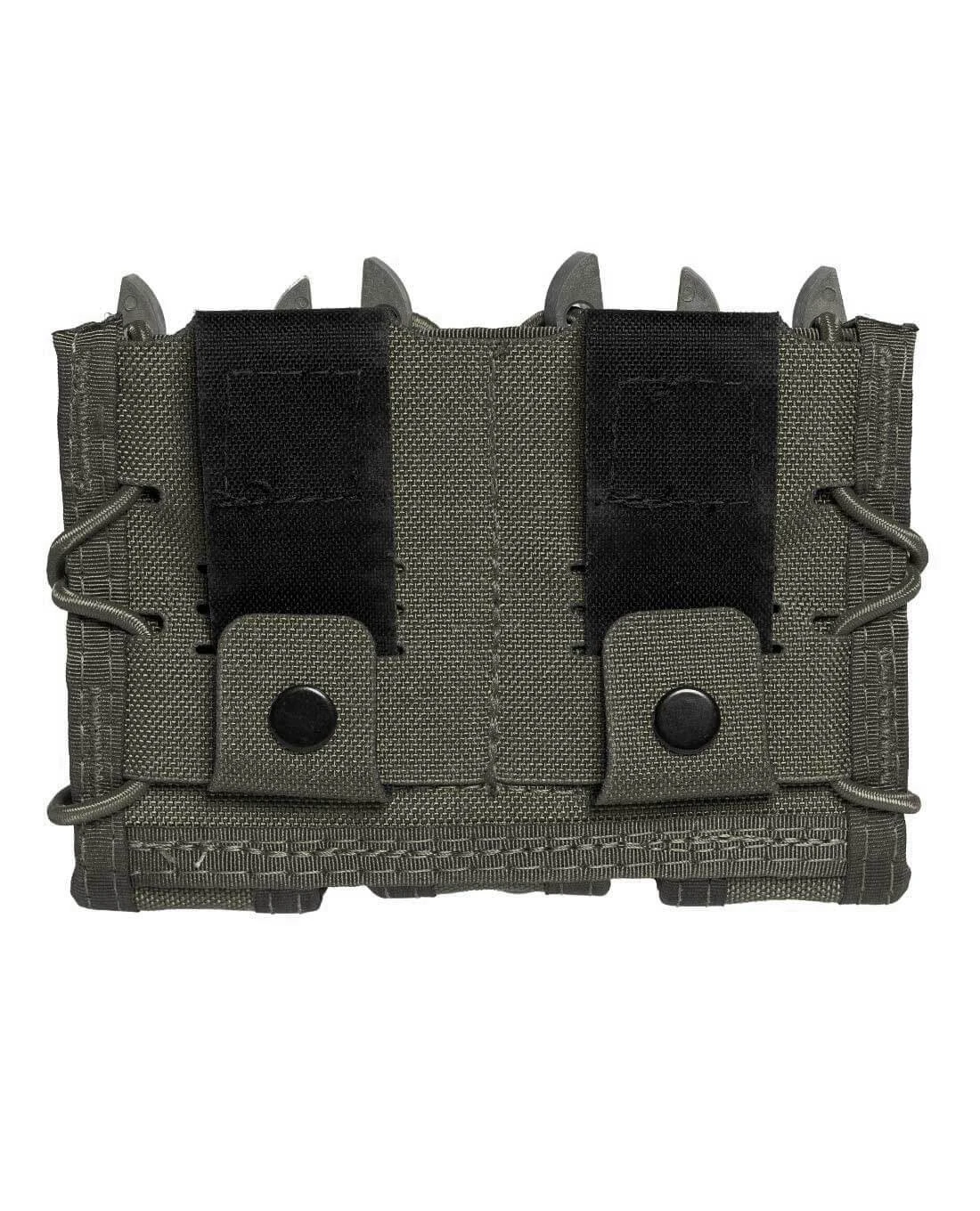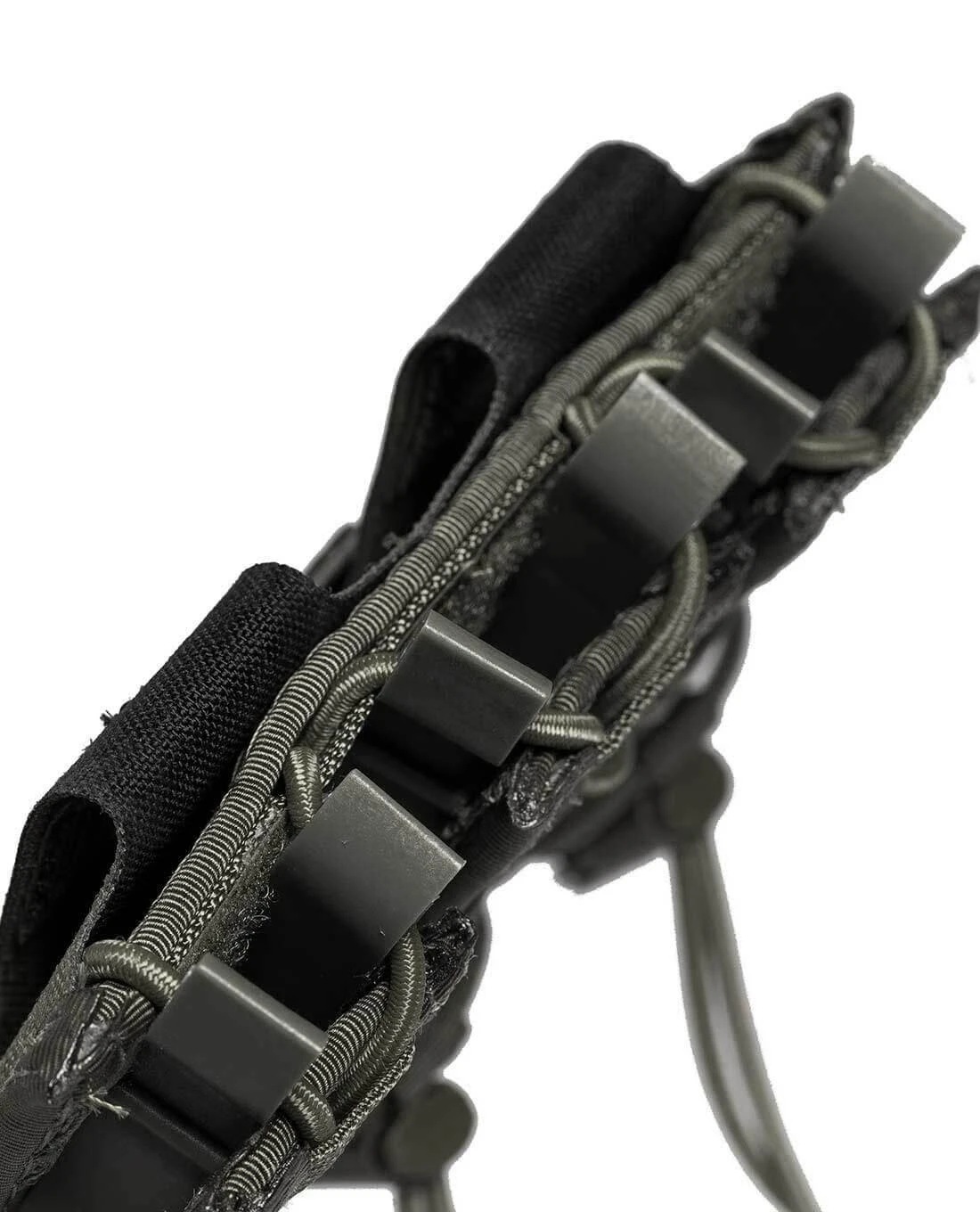 Aufgrund des 100% Nylon und der Komprimierung durch den Gummizug kann eine große Breite an Pistolen-Magazinen aufgenommen werden: 1911, HK 45, M9/Beretta 92, Glock, XD-Magazine werden alle sicher gehalten und bei Bedarf leicht und geräuschlos herausgezogen.